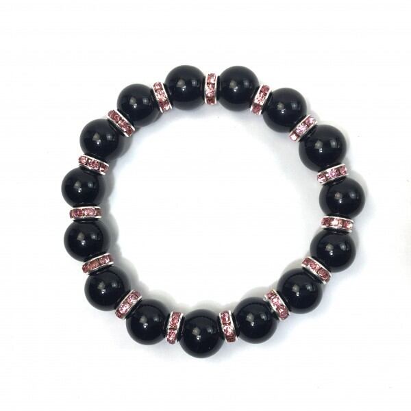 こちらは、12mm玉のオニキスを使用した天然石ブレスレットです。石との間にはロンデルを挟み高級感を演出しています。シンプルなデザインですのでどんなコーディネートとも合わせ易いブレスレットです。石大きさは12mm玉です。内周約18cmです。気になる方は是非この機会にどうぞ。