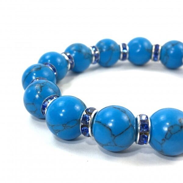 こちらは、12mm玉のターコイズを使用したブレスレットです。石との間にはロンデルを挟み高級感を演出しています。シンプルなデザインですのでどんなコーディネートとも合わせ易いブレスレットです。石大きさは12mm玉です。内周約18cmです。気になる方は是非この機会にどうぞ。