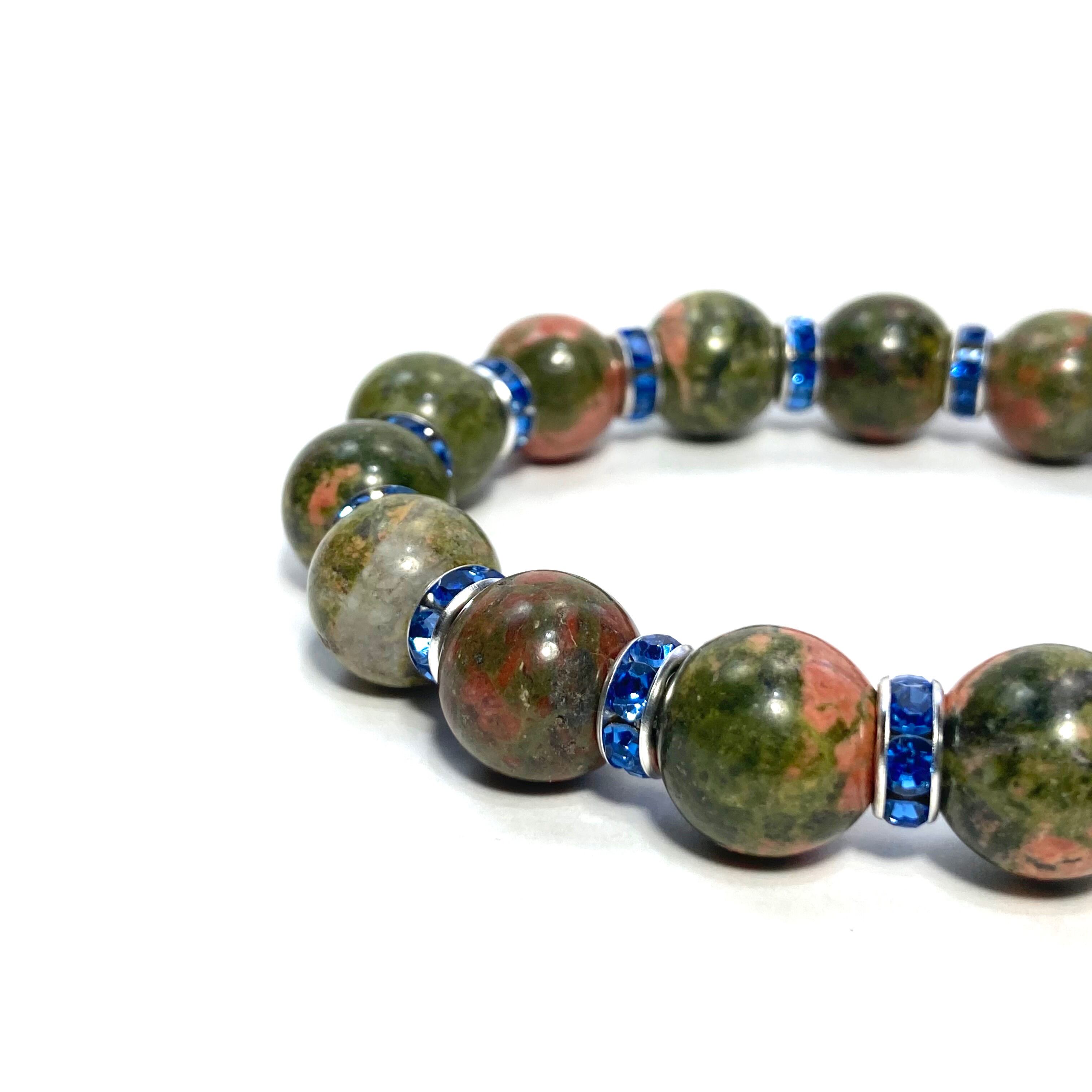 こちらは、12mm玉のユナカイトを使用した天然石ブレスレットです。石との間にはロンデルを挟み高級感を演出しています。シンプルなデザインですのでどんなコーディネートとも合わせ易いブレスレットです。石大きさは12mm玉です。内周約18cmです。気になる方は是非この機会にどうぞ。