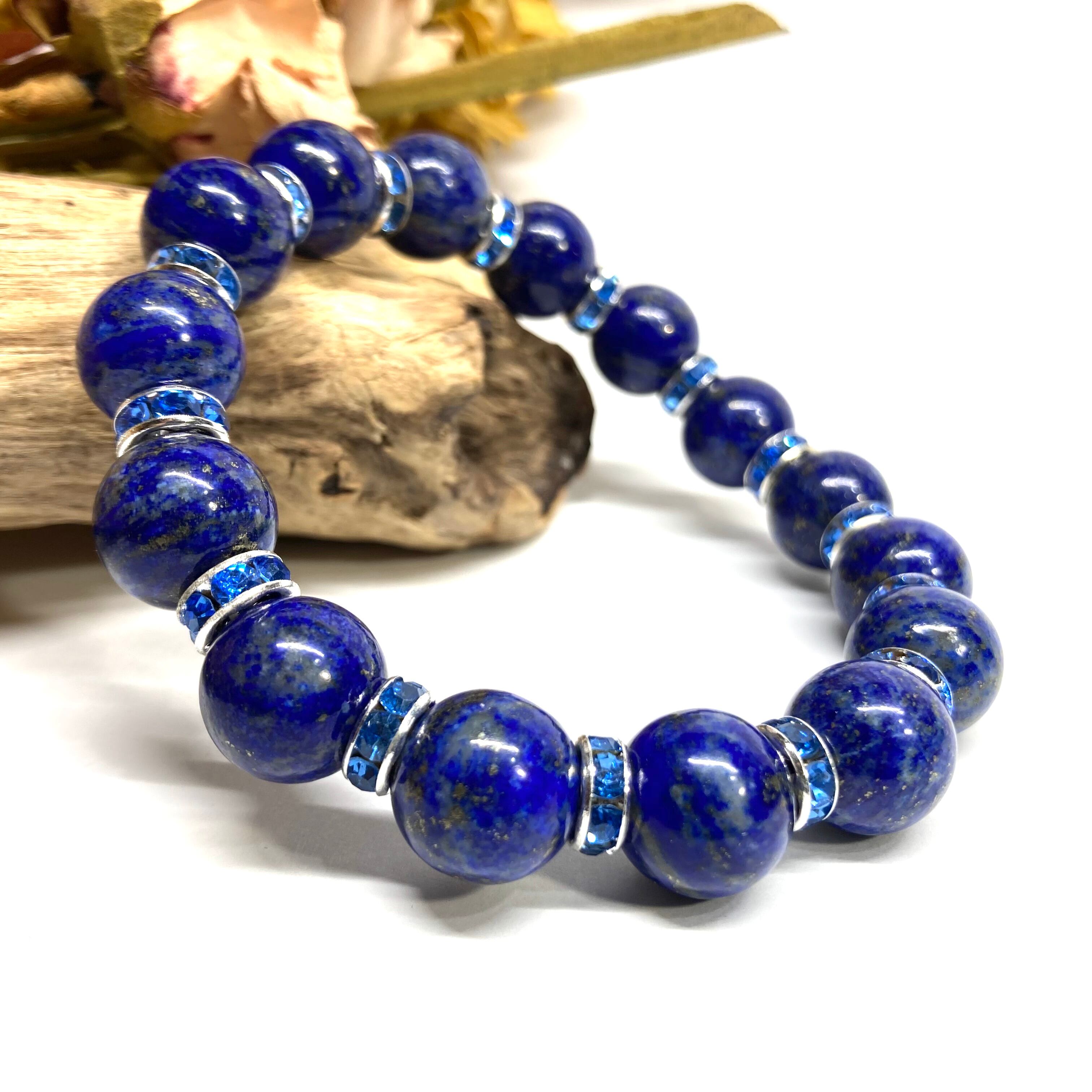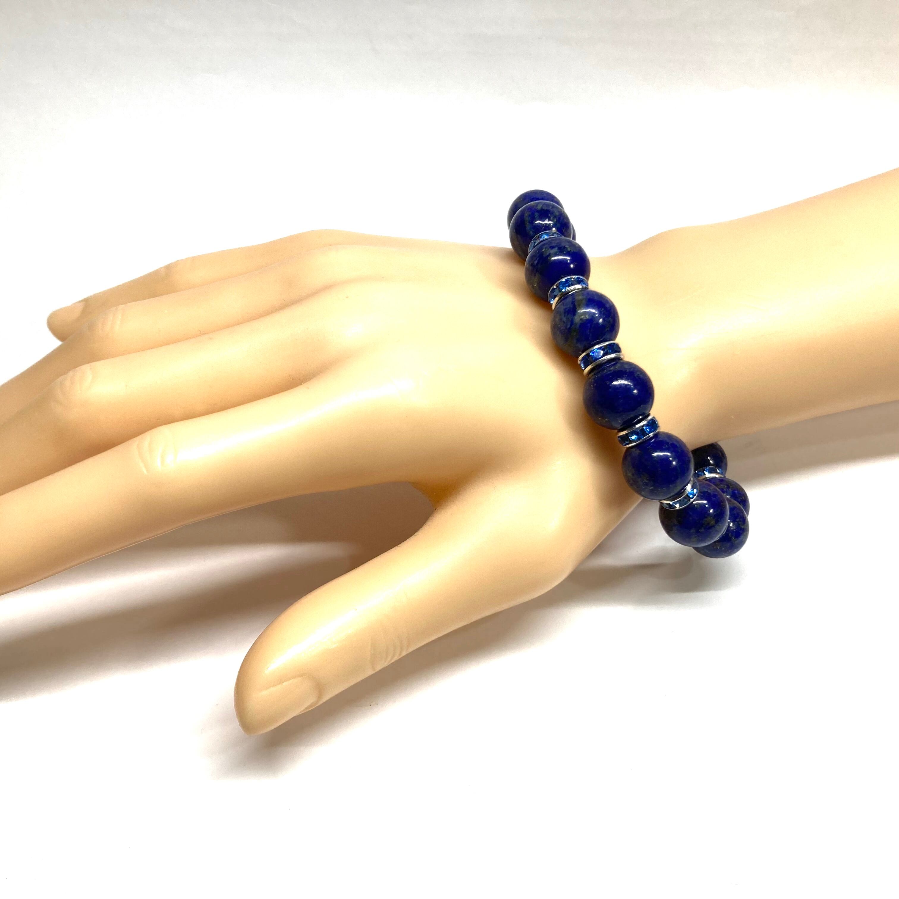 こちらは、12mm玉のラピスラズリを使用した天然石ブレスレットです。石との間にはロンデルを挟み高級感を演出しています。シンプルなデザインですのでどんなコーディネートとも合わせ易いブレスレットです。石大きさは12mm玉です。内周約18cmです。数に限りがございますので気になる方はお早めにどうぞ。