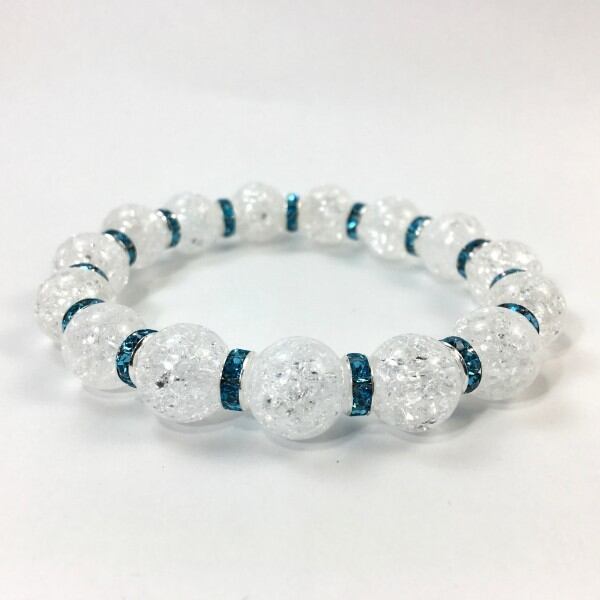 こちらは、12mm玉のクラック水晶を使用した天然石ブレスレットです。石との間にはロンデルを挟み高級感を演出しています。シンプルなデザインですのでどんなコーディネートとも合わせ易いブレスレットです。石大きさは12mm玉です。内周約18cmです。気になる方は是非この機会にどうぞ。