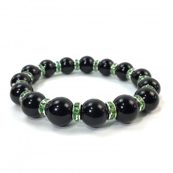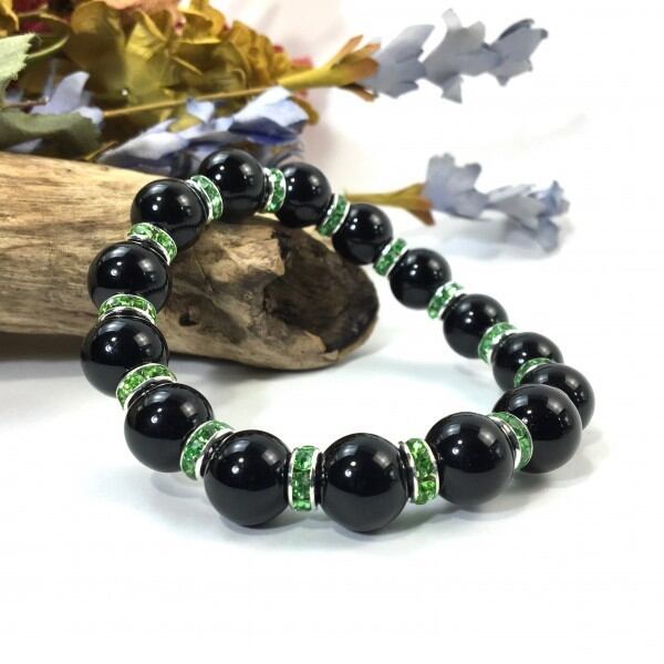こちらは、12mm玉のオニキスを使用した天然石ブレスレットです。石との間にはロンデルを挟み高級感を演出しています。シンプルなデザインですのでどんなコーディネートとも合わせ易いブレスレットです。石大きさは12mm玉です。内周約18cmです。気になる方は是非この機会にどうぞ。