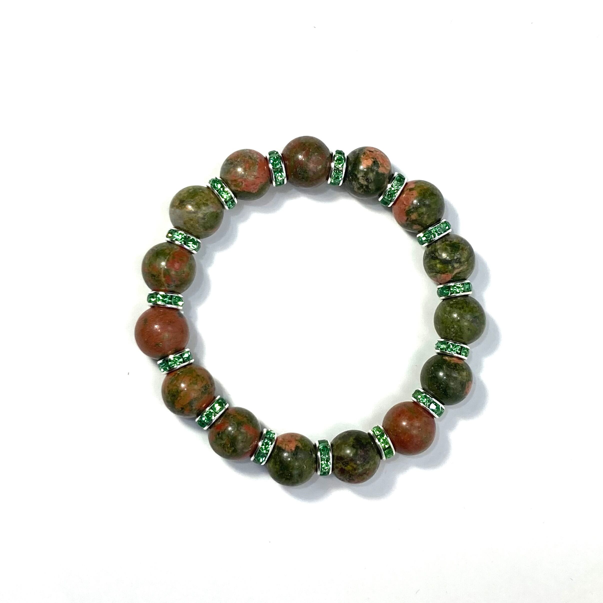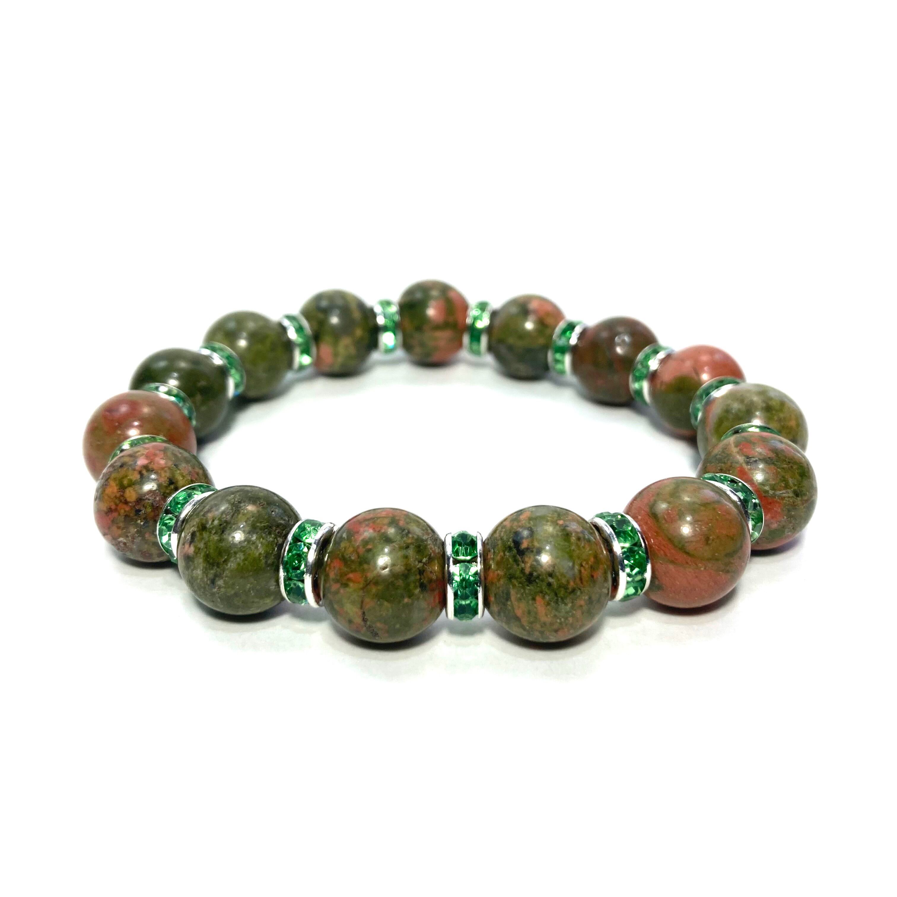 こちらは、12mm玉のユナカイトを使用した天然石ブレスレットです。石との間にはロンデルを挟み高級感を演出しています。シンプルなデザインですのでどんなコーディネートとも合わせ易いブレスレットです。石大きさは12mm玉です。内周約18cmです。気になる方は是非この機会にどうぞ。