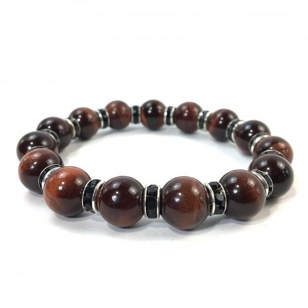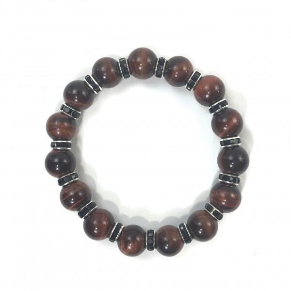 こちらは、12mm玉のレッドタイガーアイを使用した天然石ブレスレットです。石との間にはロンデルを挟み高級感を演出しています。シンプルなデザインですのでどんなコーディネートとも合わせ易いブレスレットです。石大きさは12mm玉です。内周約18cmです。気になる方は是非この機会にどうぞ。