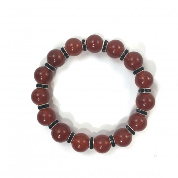 こちらは、12mm玉の赤瑪瑙を使用した天然石ブレスレットです。石との間にはロンデルを挟み高級感を演出しています。シンプルなデザインですのでどんなコーディネートとも合わせ易いブレスレットです。石大きさは12mm玉です。。内周約18cmです。気になる方は是非この機会にどうぞ。
