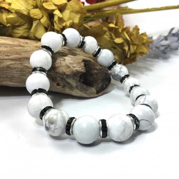 こちらは、12mm玉のハウライトを使用した天然石ブレスレットです。石との間にはロンデルを挟み高級感を演出しています。シンプルなデザインですのでどんなコーディネートとも合わせ易いブレスレットです。石大きさは12mm玉です。内周約18cmです。気になる方は是非この機会にどうぞ。