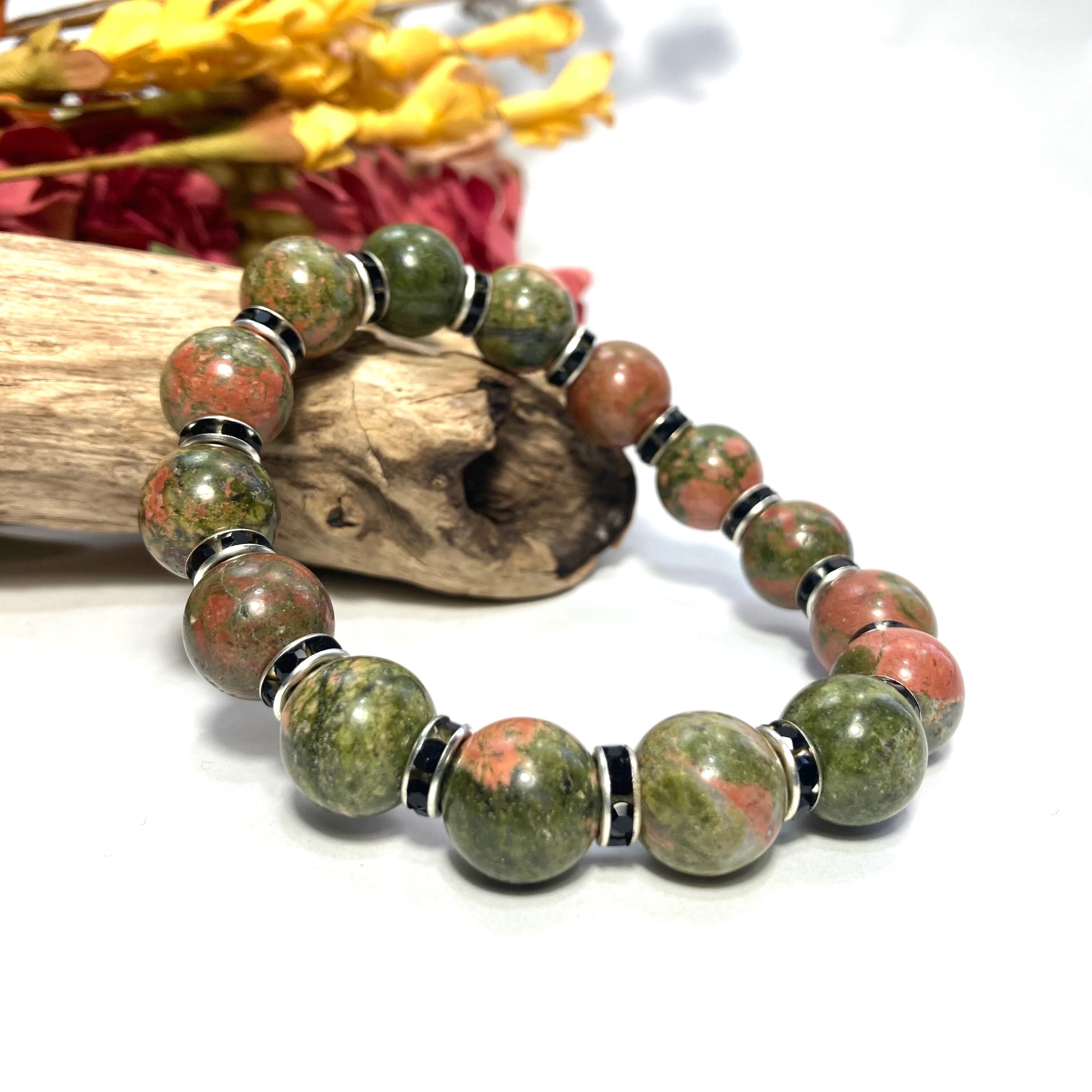 こちらは、12mm玉のユナカイトを使用した天然石ブレスレットです。石との間にはロンデルを挟み高級感を演出しています。シンプルなデザインですのでどんなコーディネートとも合わせ易いブレスレットです。石大きさは12mm玉です。内周約18cmです。気になる方は是非この機会にどうぞ。