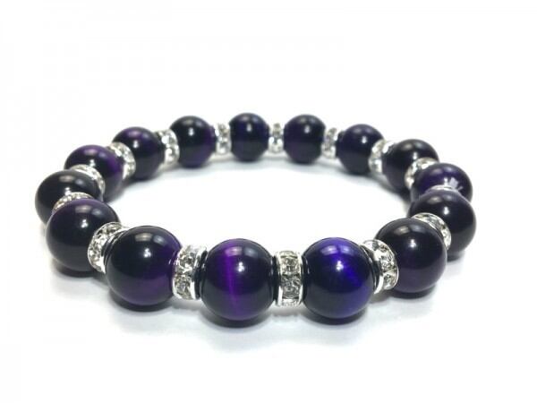 こちらは、12mm玉のパープルタイガーアイを使用したブレスレットです。石との間にはロンデルを挟み高級感を演出しています。シンプルなデザインですのでどんなコーディネートとも合わせ易いブレスレットです。石大きさは12mm玉です。内周約18cmです。気になる方は是非この機会にどうぞ。