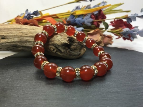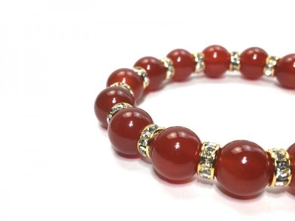 こちらは、12mm玉の赤瑪瑙を使用した天然石ブレスレットです。石との間にはロンデルを挟み高級感を演出しています。シンプルなデザインですのでどんなコーディネートとも合わせ易いブレスレットです。石大きさは12mm玉です。。内周約18cmです。気になる方は是非この機会にどうぞ。