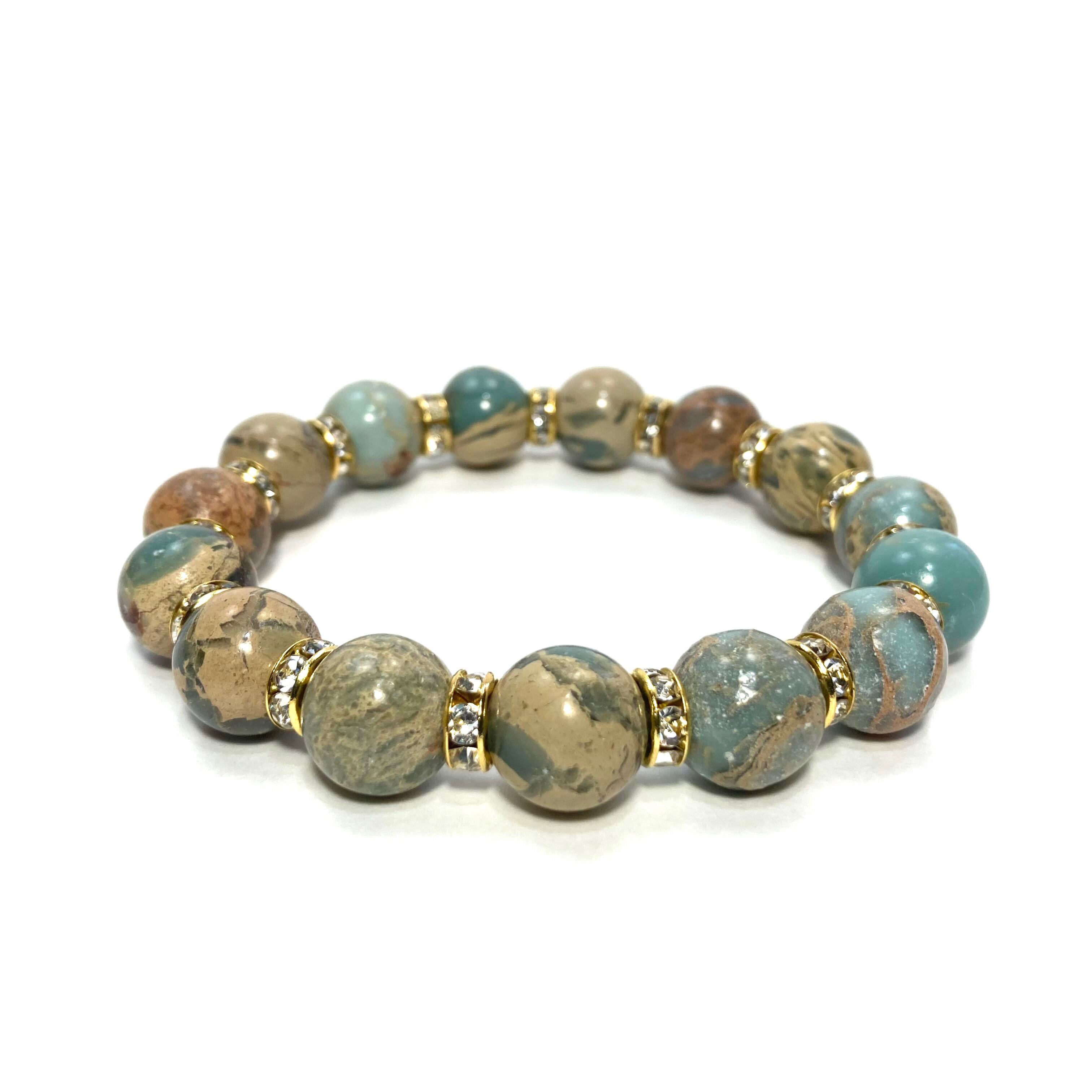 こちらは、12mm玉のインプレッションストーンを使用した天然石ブレスレットです。石との間にはロンデルを挟み高級感を演出しています。シンプルなデザインですのでどんなコーディネートとも合わせ易いブレスレットです。石大きさは12mm玉です。内周約18cmです。気になる方は是非この機会にどうぞ。