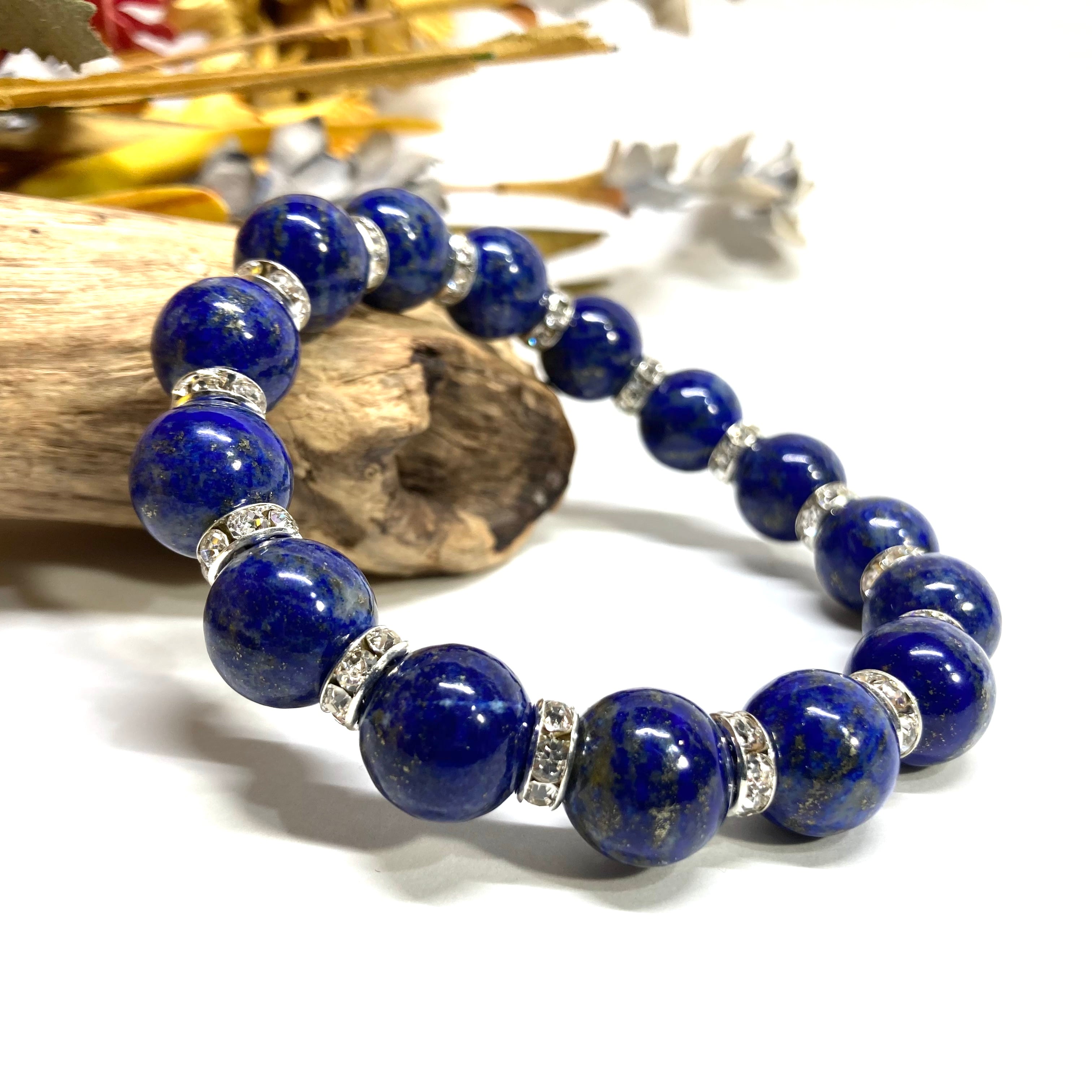 こちらは、12mm玉のラピスラズリを使用したブレスレットです。石との間にはロンデルを挟み高級感を演出しています。シンプルなデザインですのでどんなコーディネートとも合わせ易いブレスレットです。石大きさは12mm玉です。内周約18cmです。数に限りがございますので気になる方はお早めにどうぞ。