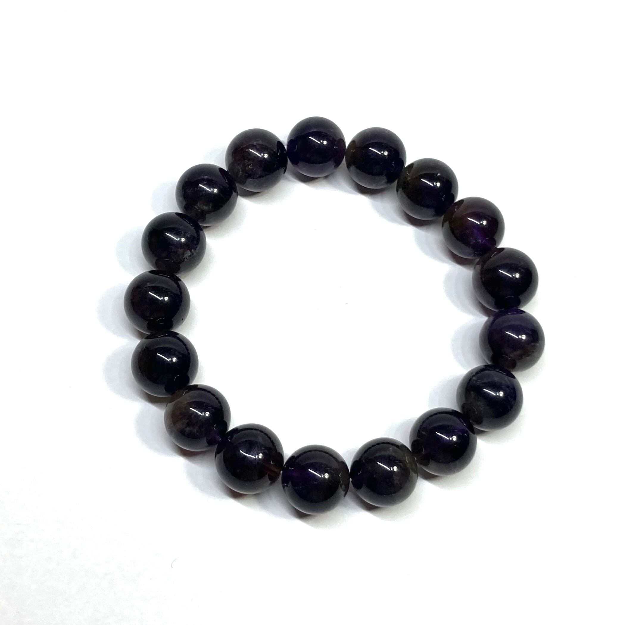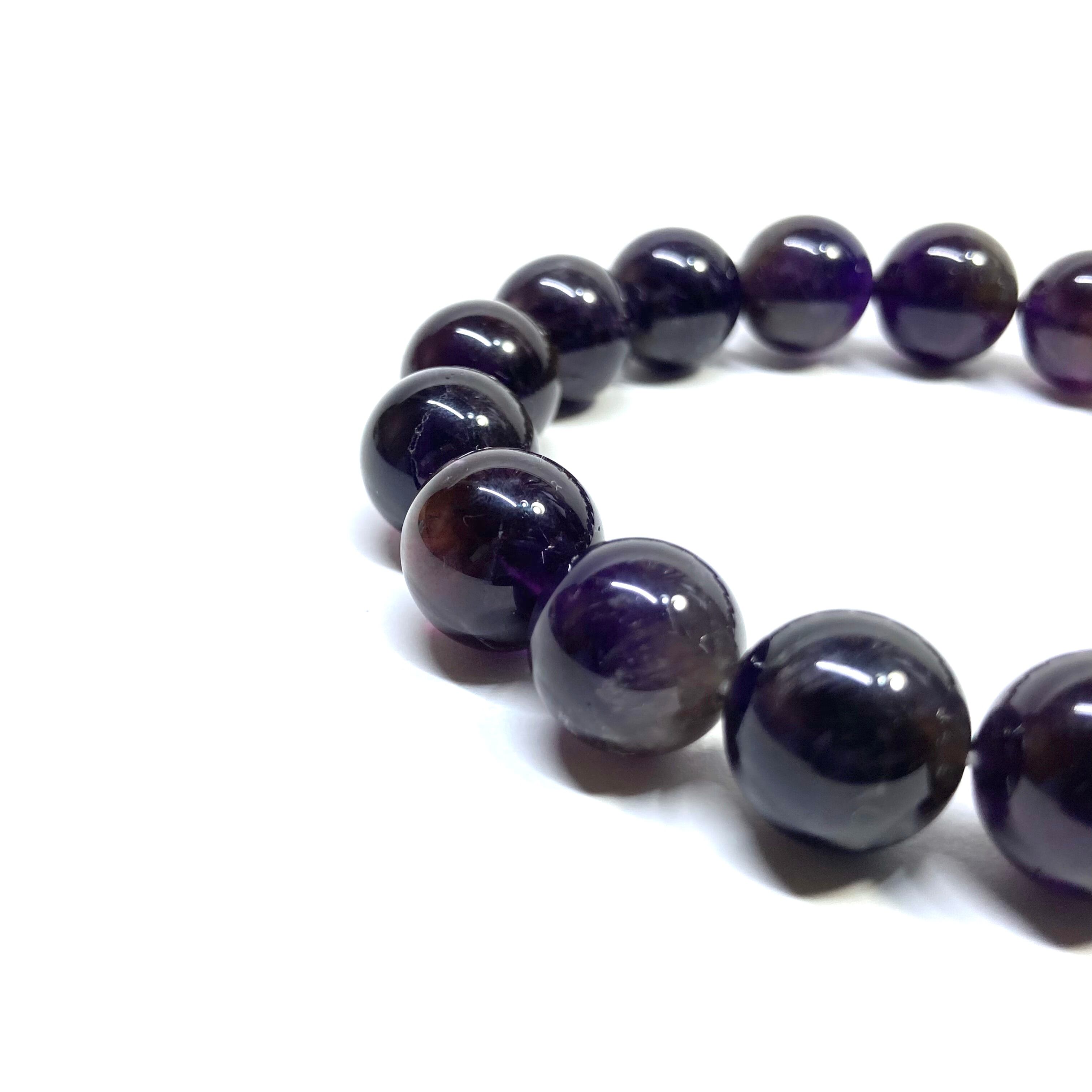 こちらは、12mm玉のアメジストを使用したパワーストーンブレスレットです。シンプルなデザインは、男女問わずどんなコーディネートとも合わせ易いブレスレットです。サイズは内周約17cmです。 数に限りがございますので気になる方はお早めにどうぞ。