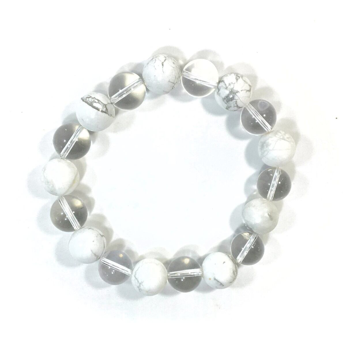 こちらは、水晶とハウライトを交互に組み合わせたパワーストーンブレスレットです。シンプルなデザインですのでどんなコーディネートとも合わせ易いブレスレットです。程よくインパクトがある12mm玉を使用して内周約18cmです。数に限りがございますので気になる方はお早めにどうぞ。