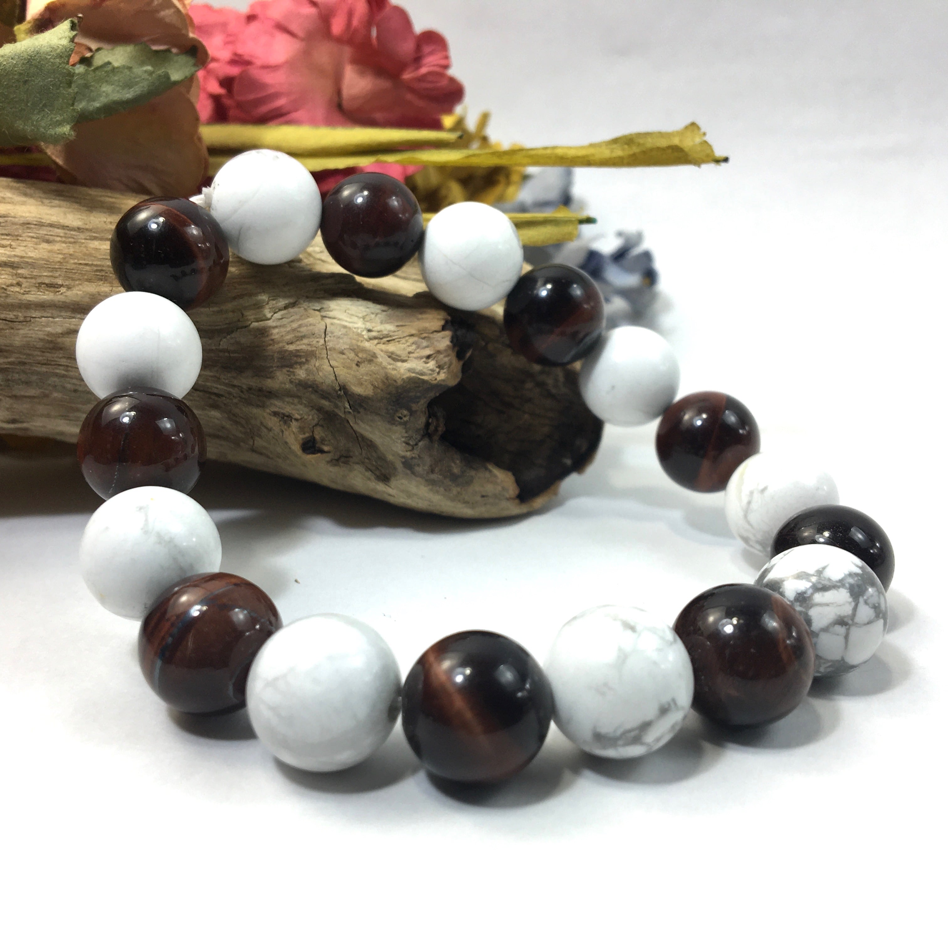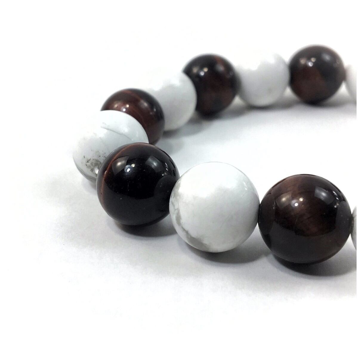 こちらは、ハウライトとレッドタイガーアイを交互に組み合わせたパワーストーンブレスレットです。シンプルなデザインですのでどんなコーディネートとも合わせ易いブレスレットです。程よくインパクトがある12mm玉を使用して内周約18cmです。数に限りがございますので気になる方はお早めにどうぞ。