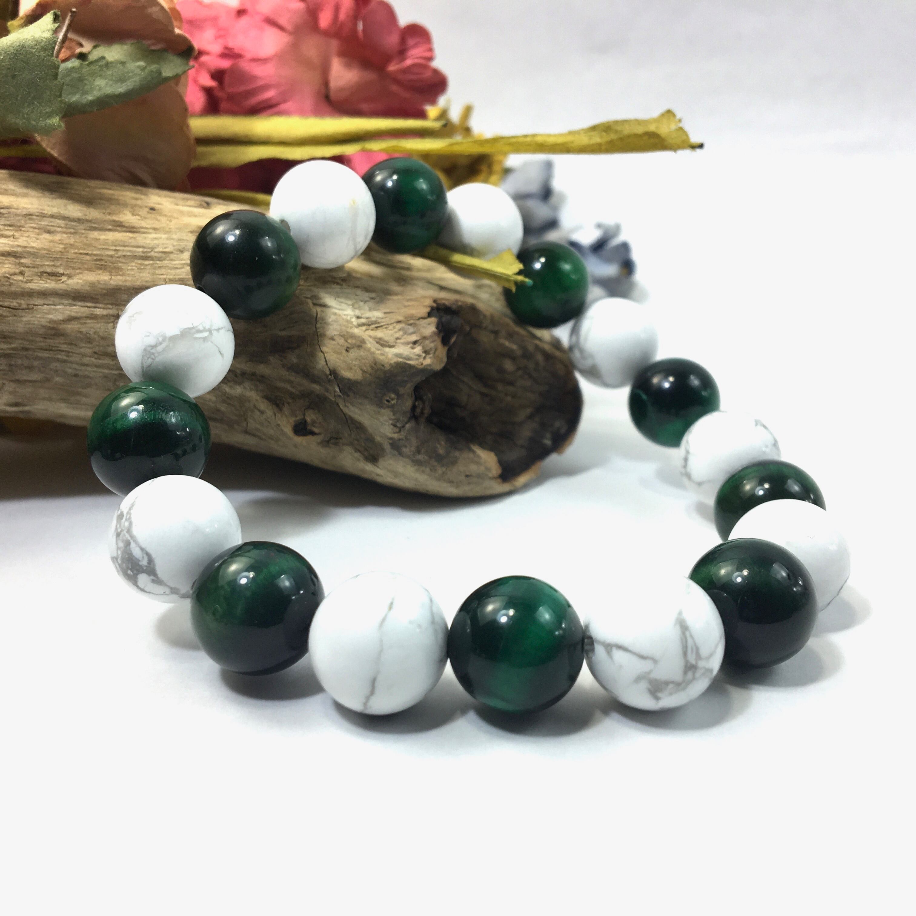 こちらは、ハウライトとグリーンタイガーアイを交互に組み合わせたパワーストーンブレスレットです。シンプルなデザインですのでどんなコーディネートとも合わせ易いブレスレットです。程よくインパクトがある12mm玉を使用して内周約18cmです。数に限りがございますので気になる方はお早めにどうぞ。