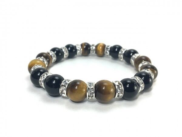 こちらは、タイガーアイとオニキスを組み合わせたブレスレットです。間にはロンデルを挟み高級感あるデザインに仕上がっています。石大きさは腕にも馴染みやすいように10mm玉で内周約16cm(伸可能)です。数に限りがございますので気になる方はお早めにどうぞ。