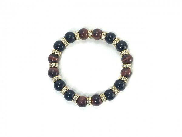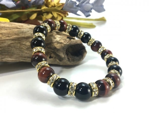 こちらは、レッドタイガーアイとオニキスを組み合わせたブレスレットです。間にはロンデルを挟み高級感あるデザインに仕上がっています。石大きさは腕にも馴染みやすいように10mm玉で内周約16cm(伸可能)です。数に限りがございますので気になる方はお早めにどうぞ。