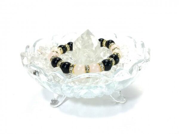 こちらは、ローズクォーツとオニキスを組み合わせたブレスレットです。間にはロンデルを挟み高級感あるデザインに仕上がっています。石大きさは腕にも馴染みやすいように10mm玉で内周約16cm(伸可能)です。数に限りがございますので気になる方はお早めにどうぞ。