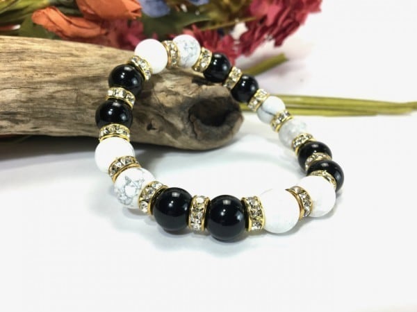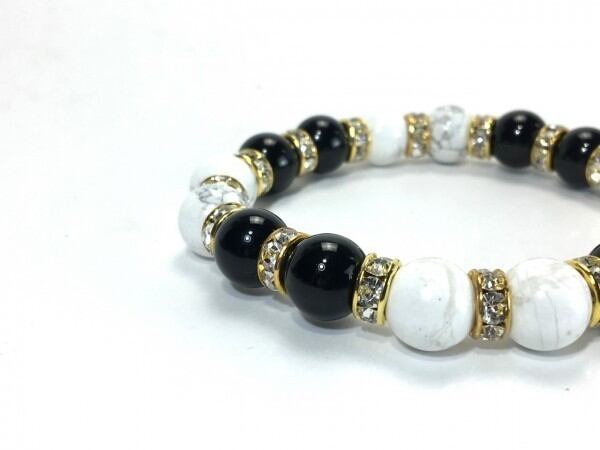 こちらは、ハウライトとオニキスを組み合わせたブレスレットです。間にはロンデルを挟み高級感あるデザインに仕上がっています。石大きさは腕にも馴染みやすいように10mm玉で内周約16cm(伸可能)です。数に限りがございますので気になる方はお早めにどうぞ。