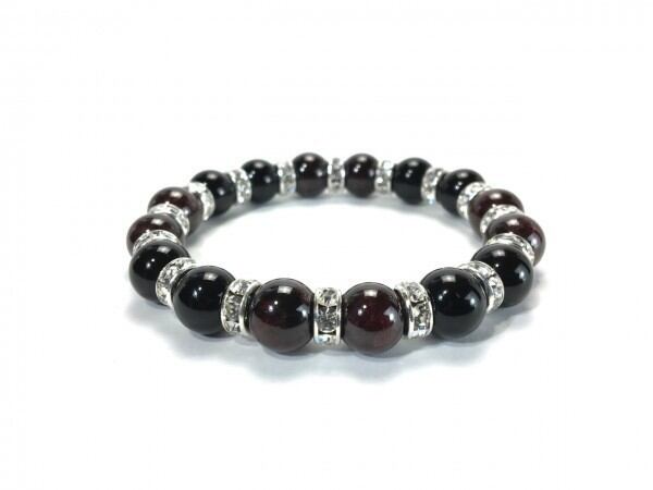 こちらは、ガーネットとオニキスを組み合わせたブレスレットです。間にはロンデルを挟み高級感あるデザインに仕上がっています。石大きさは腕にも馴染みやすいように10mm玉で内周約16cm(伸可能)です。数に限りがございますので気になる方はお早めにどうぞ。