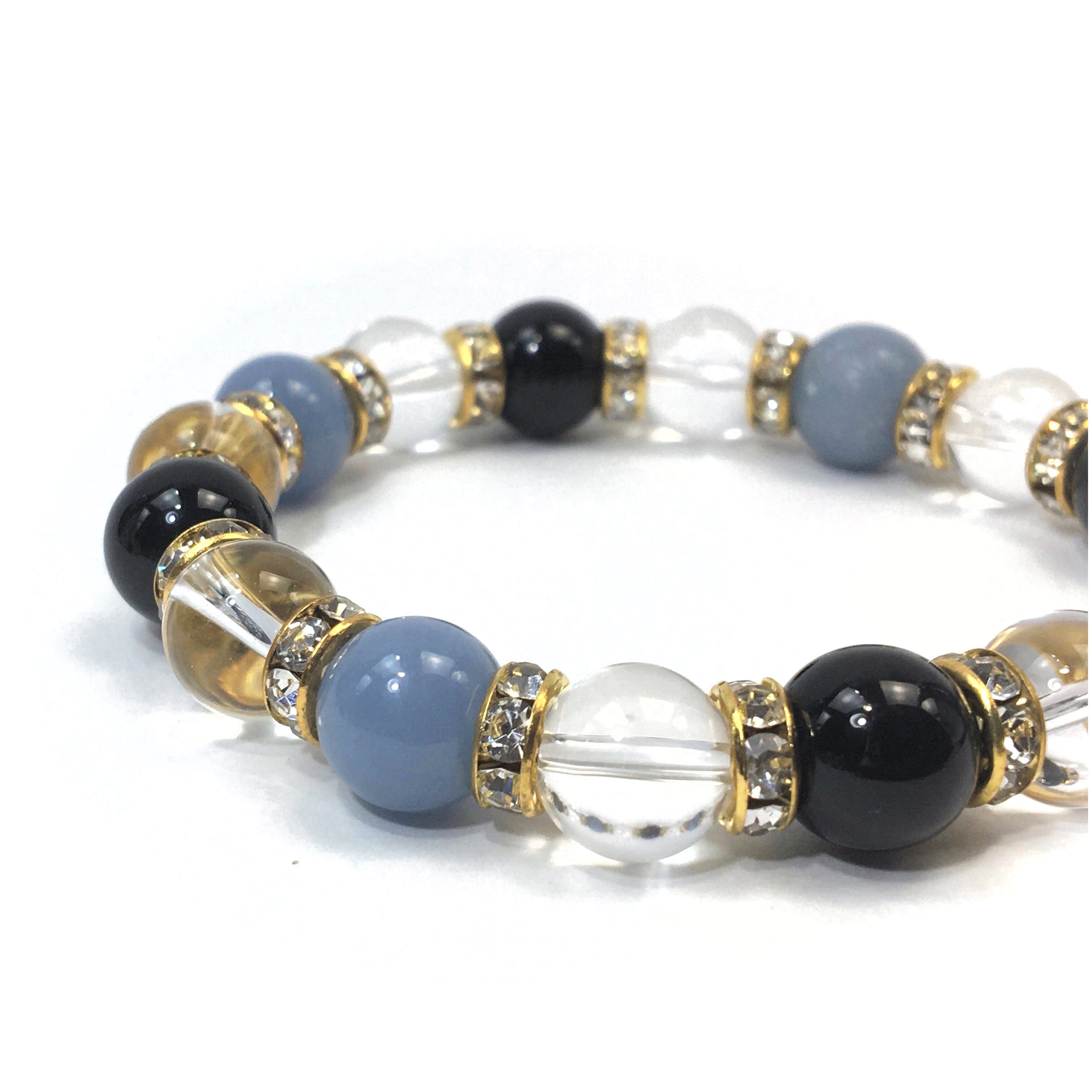 こちらは、エンジェライトと水晶とオニキスを組み合わせたブレスレットです。間にはロンデルを挟み高級感あるデザインに仕上がっています。石大きさは腕にも馴染みやすいように10mm玉で内周約16cmです。数に限りがございますので気になる方はお早めにどうぞ。