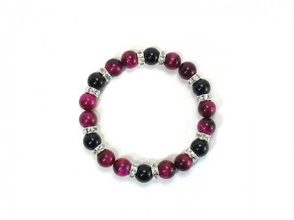 こちらは、ピンクタイガーアイとオニキスを組み合わせたブレスレットです。間にはロンデルを挟み高級感あるデザインに仕上がっています。石大きさは腕にも馴染みやすいように10mm玉で内周約17cm(伸可能)です。数に限りがございますので気になる方はお早めにどうぞ。