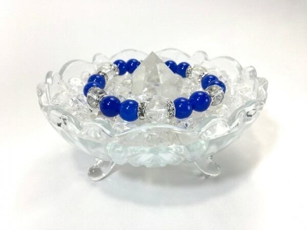 こちらは、ブルーメノウと水晶を組み合わせたブレスレットです。間にはロンデルを挟み高級感あるデザインに仕上がっています。石大きさは腕にも馴染みやすいように10mm玉で内周約17cm(伸可能)です。数に限りがございますので気になる方はお早めにどうぞ。