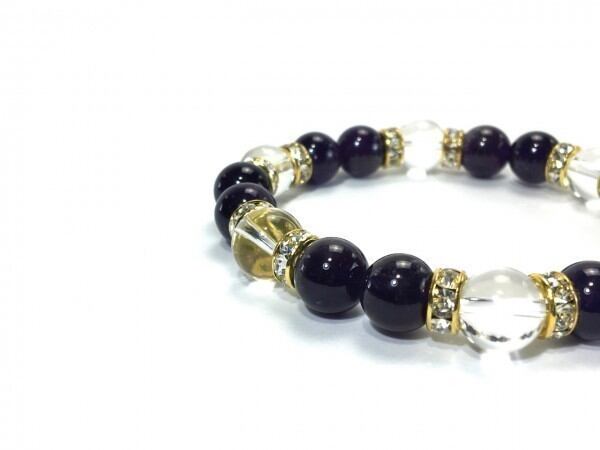 こちらは、アメジストと水晶を組み合わせたブレスレットです。間にはロンデルを挟み高級感あるデザインに仕上がっています。石大きさは腕にも馴染みやすいように10mm玉で内周約17cm(伸可能)です。数に限りがございますので気になる方はお早めにどうぞ。