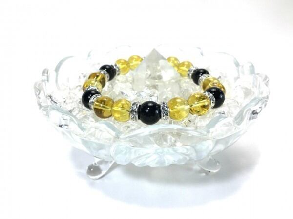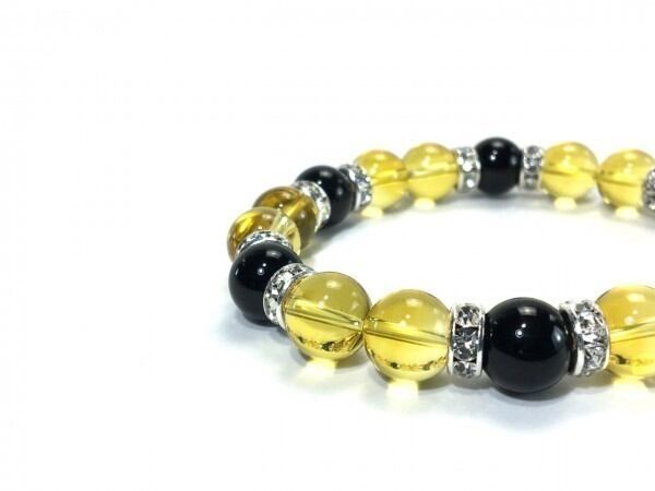 こちらは、シトリンとオニキスを組み合わせたブレスレットです。間にはロンデルを挟み高級感あるデザインに仕上がっています。石大きさは腕にも馴染みやすいように10mm玉で内周約17cm(伸可能)です。数に限りがございますので気になる方はお早めにどうぞ。