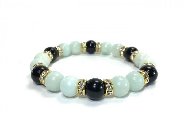 こちらは、アマゾナイトとオニキスを組み合わせたブレスレットです。間にはロンデルを挟み高級感あるデザインに仕上がっています。石大きさは腕にも馴染みやすいように10mm玉で内周約17cm(伸可能)です。数に限りがございますので気になる方はお早めにどうぞ。