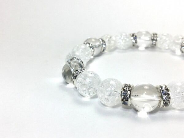 こちらは、クラック水晶と水晶を組み合わせたブレスレットです。間にはロンデルを挟み高級感あるデザインに仕上がっています。石大きさは腕にも馴染みやすいように10mm玉で内周約17cm(伸可能)です。数に限りがございますので気になる方はお早めにどうぞ。