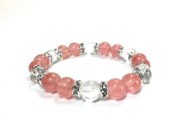 こちらは、チェリークォーツと水晶を組み合わせたブレスレットです。間にはロンデルを挟み高級感あるデザインに仕上がっています。石大きさは腕にも馴染みやすいように10mm玉で内周約17cm(伸可能)です。数に限りがございますので気になる方はお早めにどうぞ。