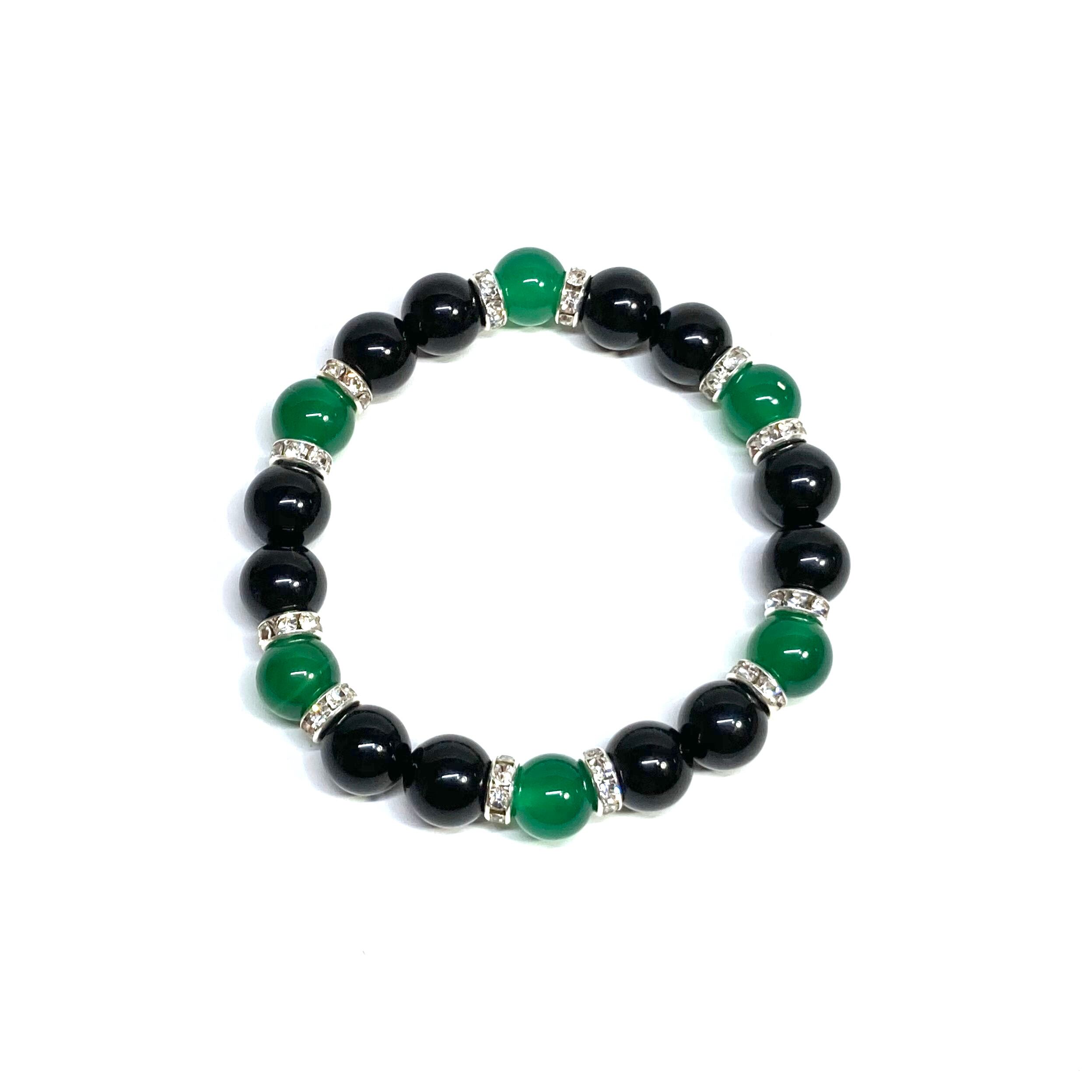 こちらは、モリオンと緑瑪瑙を組み合わせたパワーストーンブレスレットです。間にはロンデルを挟み高級感あるデザインに仕上げております。石大きさは腕にも馴染みやすいように10mm玉で内径約18cm(伸可能)です。 数に限りがございますので気になる方はお早めにどうぞ。
