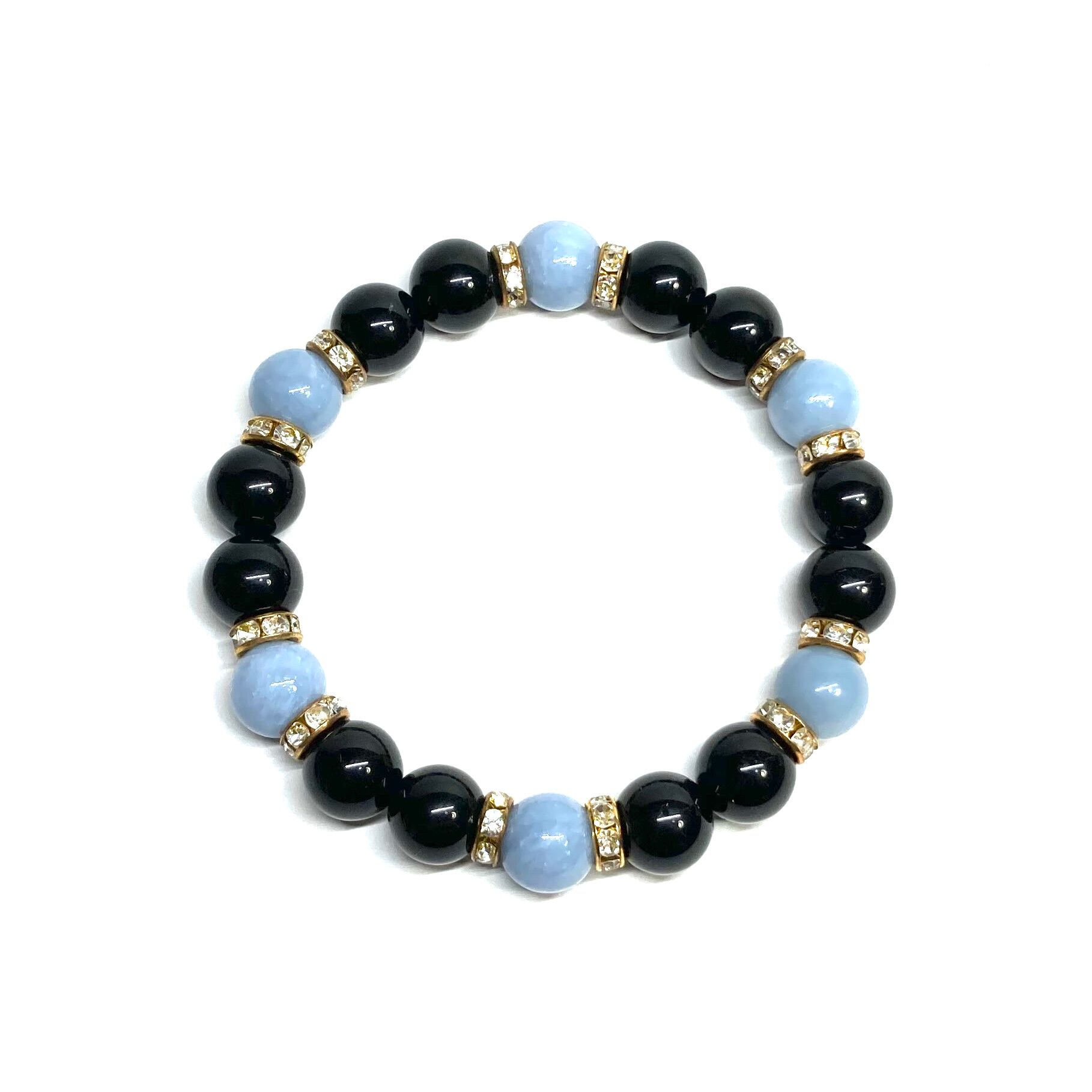 こちらは、モリオンとエンジェライトを組み合わせたパワーストーンブレスレットです。間にはロンデルを挟み高級感あるデザインに仕上げております。石大きさは腕にも馴染みやすいように10mm玉で内径約18cm(伸可能)です。 数に限りがございますので気になる方はお早めにどうぞ。