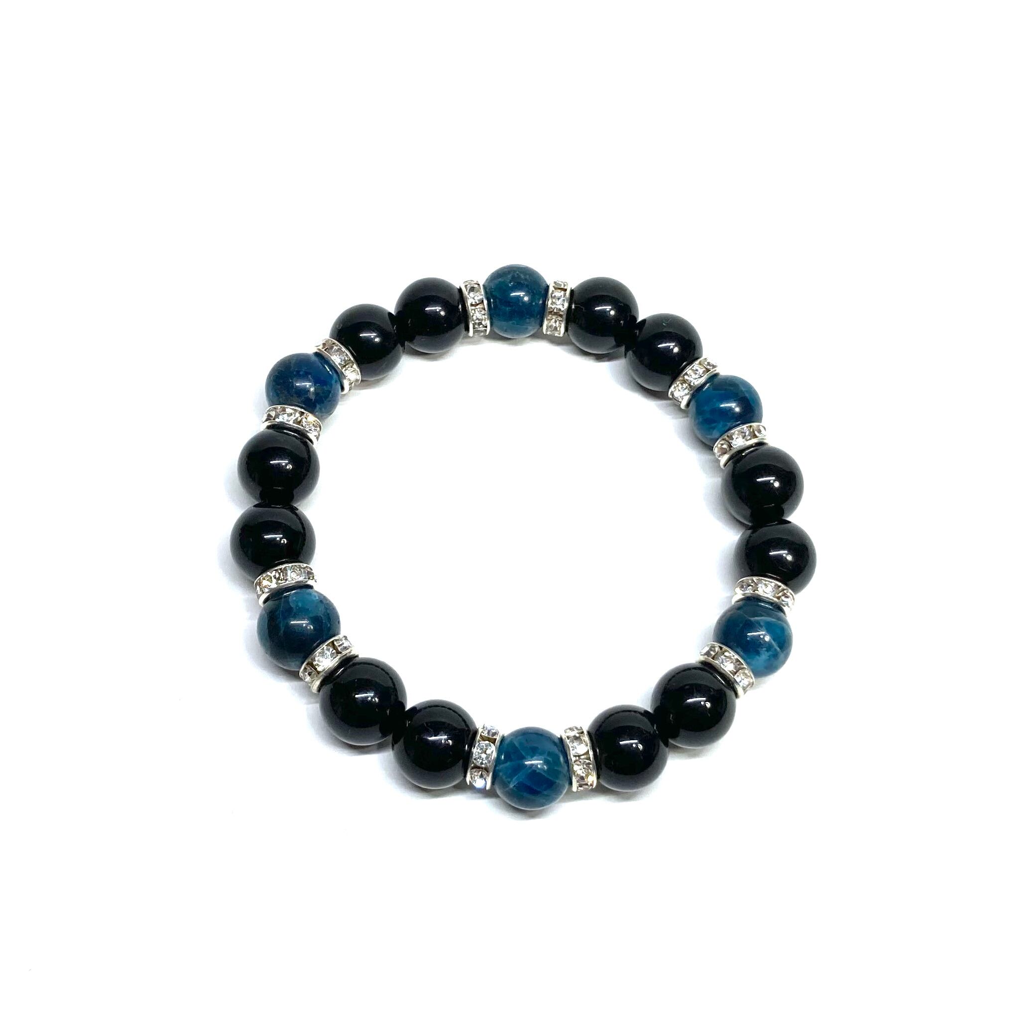 こちらは、モリオンとアパタイトを組み合わせたパワーストーンブレスレットです。間にはロンデルを挟み高級感あるデザインに仕上げております。石大きさは腕にも馴染みやすいように10mm玉で内径約18cm(伸可能)です。 数に限りがございますので気になる方はお早めにどうぞ。