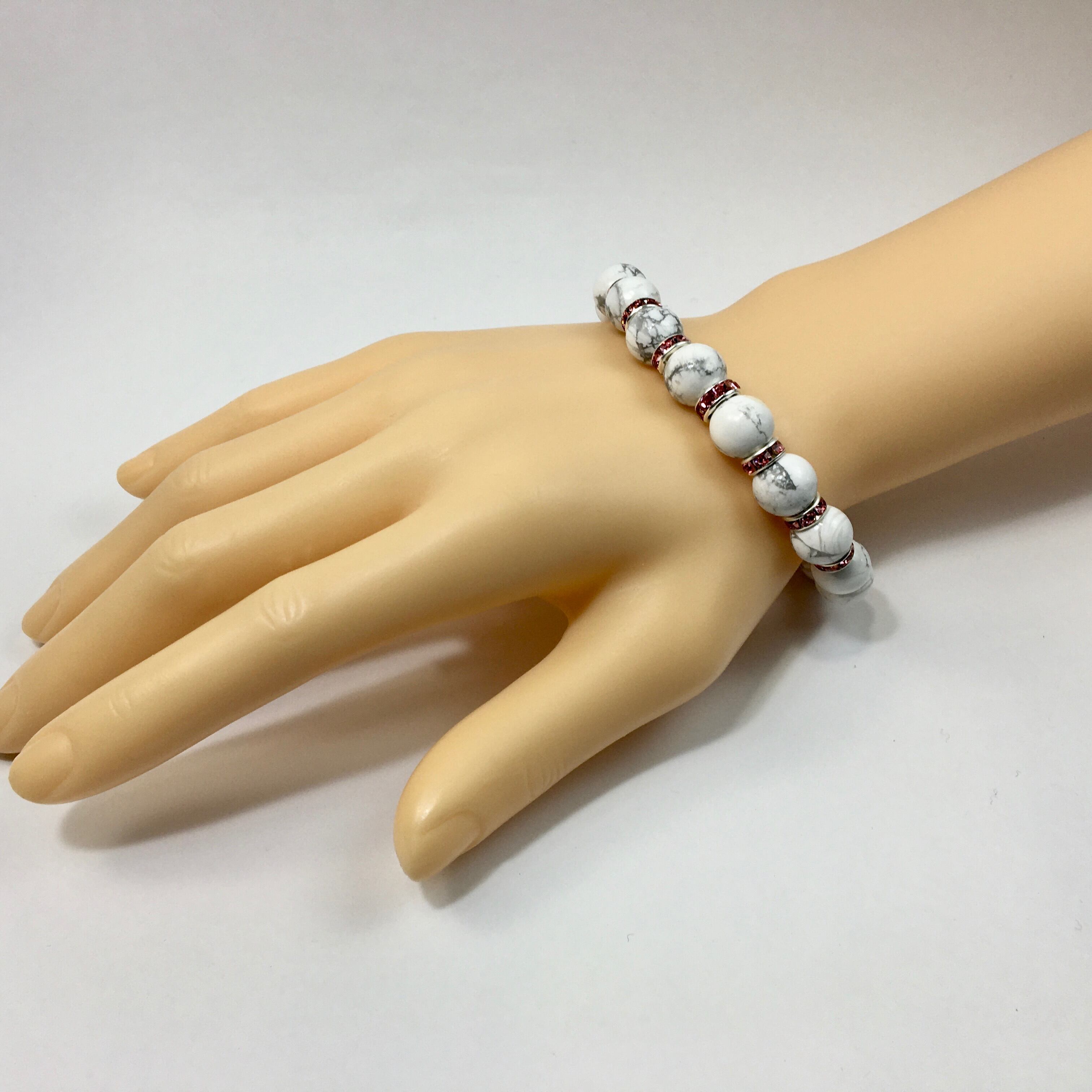 こちらは、ハウライトの10mm玉を使用したパワーストーンブレスレットです。石との間にはロンデルを挟み高級感を演出しております。シンプルなデザインは、シーン問わずどんなコーディネートとも合わせ易いブレスレットです。サイズは種類を選択からお選びください。(内周約14cm?内周約22cmでお選び頂けます)当社の中でも一番人気の実績があるデザインとなっております。気になる方はお早めにどうぞ。