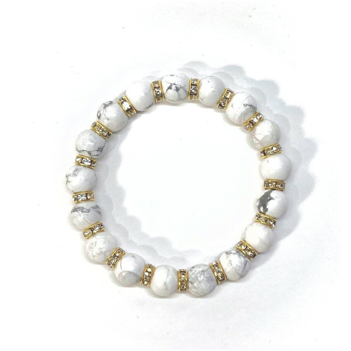こちらは、ハウライトの10mm玉を使用したパワーストーンブレスレットです。石との間にはロンデルを挟み高級感を演出しております。シンプルなデザインは、シーン問わずどんなコーディネートとも合わせ易いブレスレットです。サイズは種類を選択からお選びください。(内周約14cm?内周約22cmでお選び頂けます)当社の中でも一番人気の実績があるデザインとなっております。気になる方はお早めにどうぞ。
