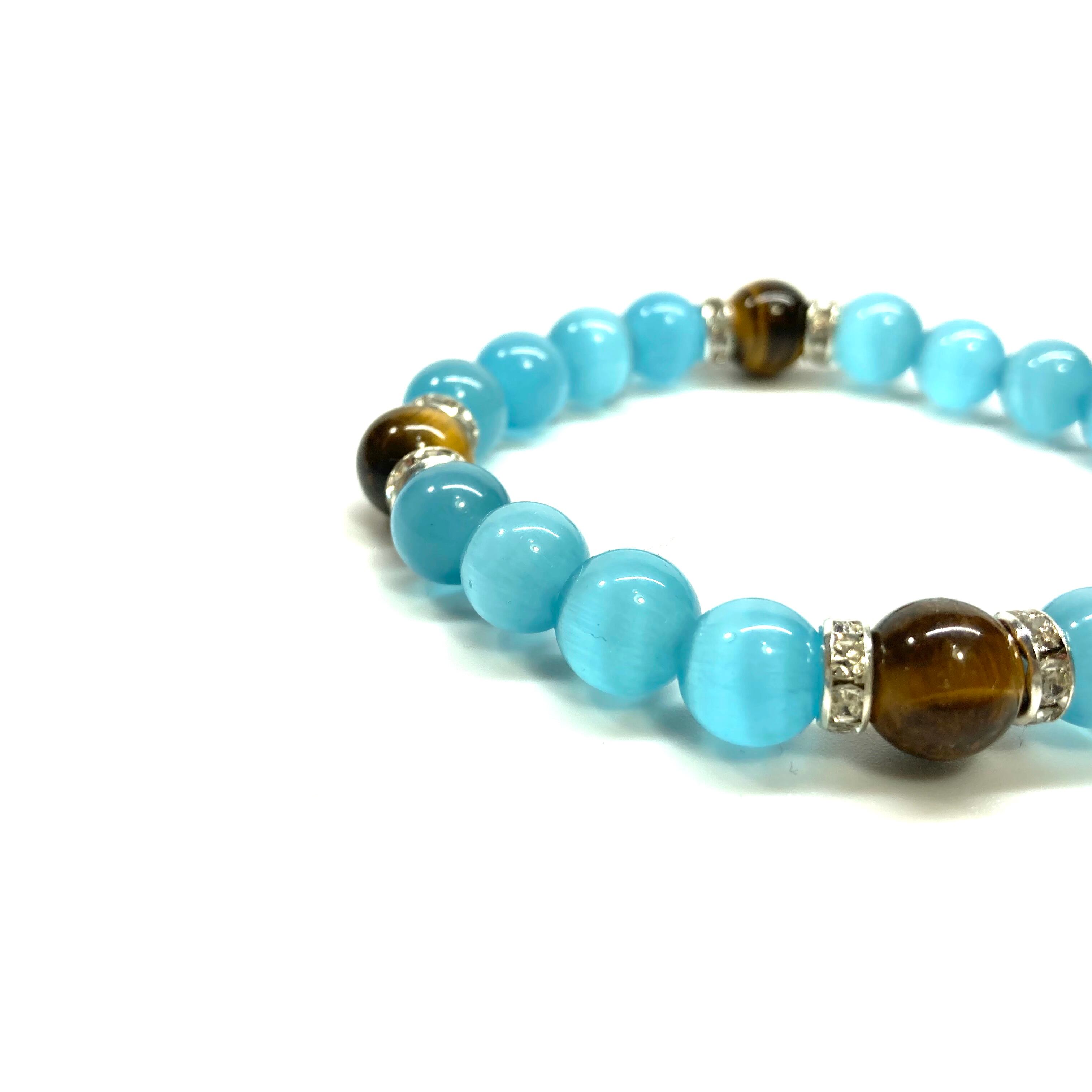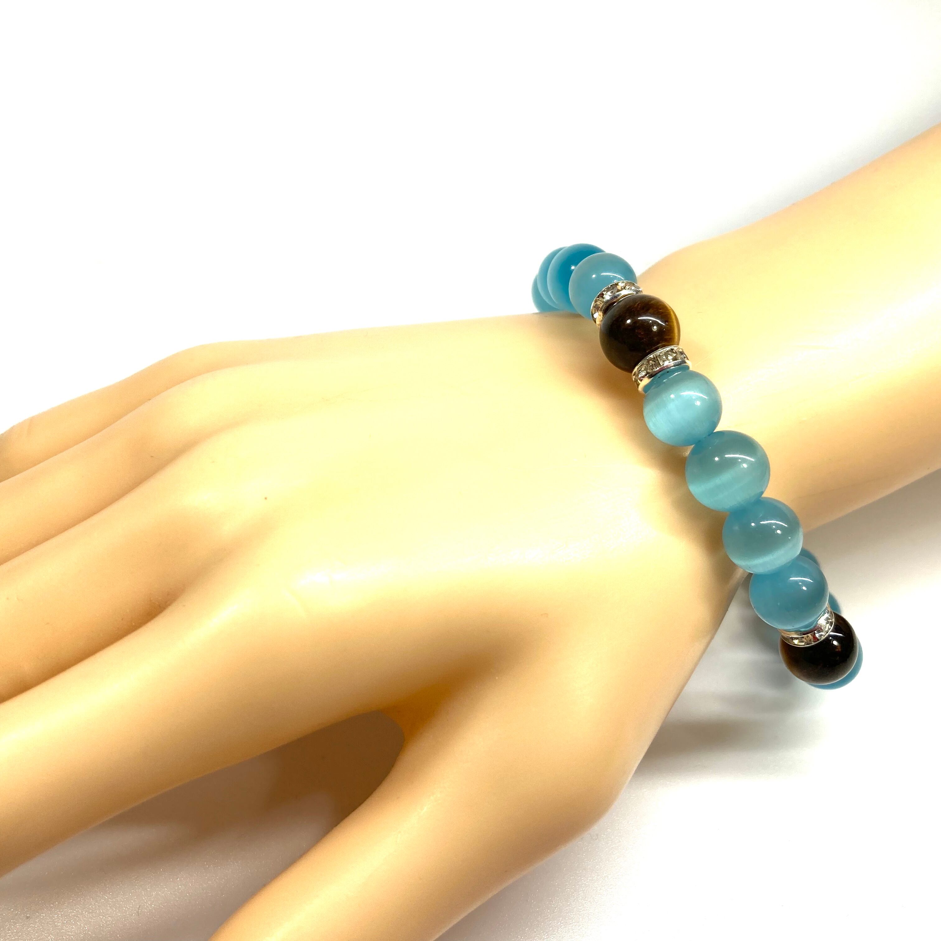キャッツアイ(ライトブルー)×タイガーアイ パワーストーン ブレスレット (シルバー) メンズ・レディース 男性・女性 数珠ブレス 開運