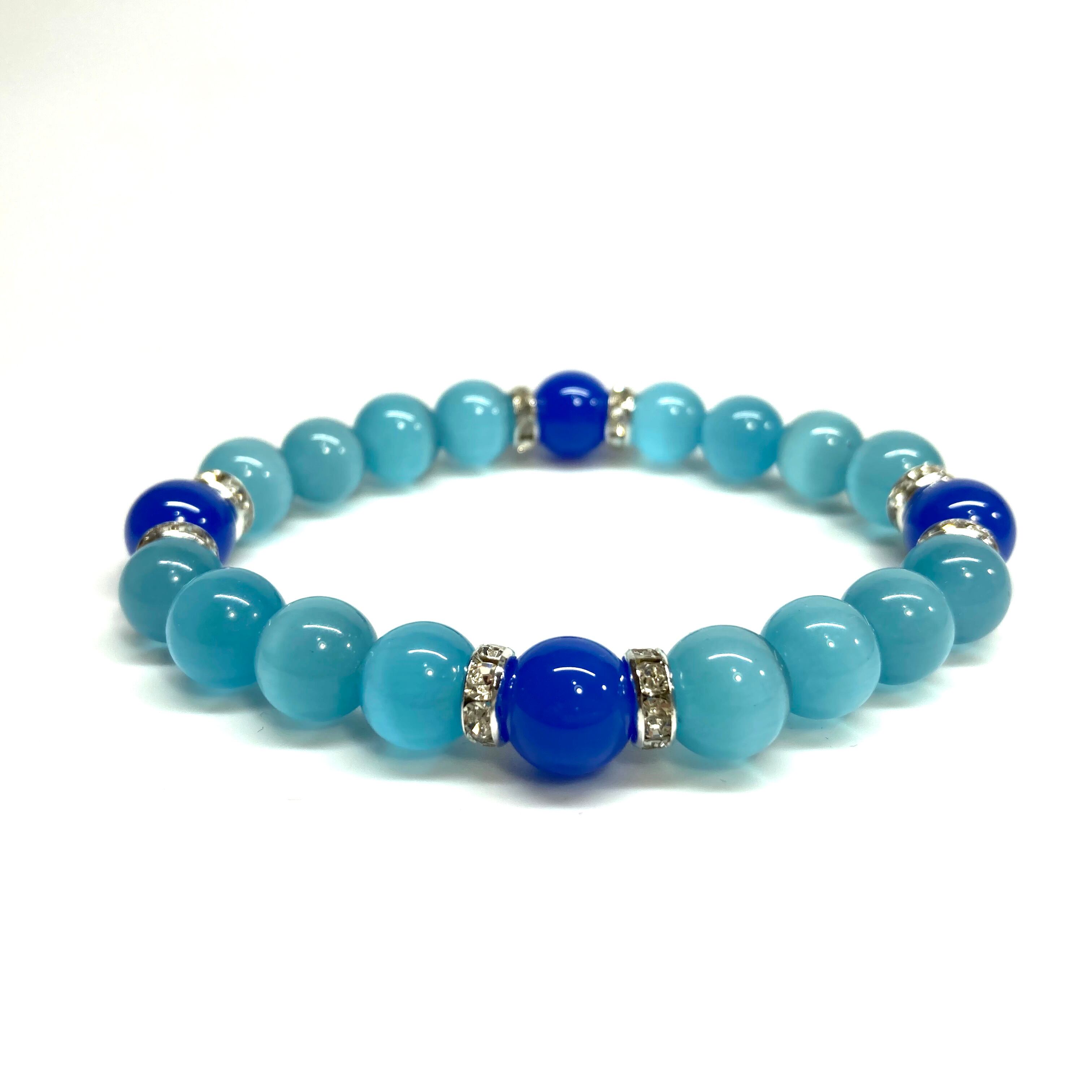 こちらは、キャッツアイと青瑪瑙を組み合わせたブレスレットです。間にはロンデルを挟み高級感あるデザインに仕上がっています。石大きさは腕にも馴染みやすいように10mm玉で内周約17cm(伸可能)です。数に限りがございますので気になる方はお早めにどうぞ。