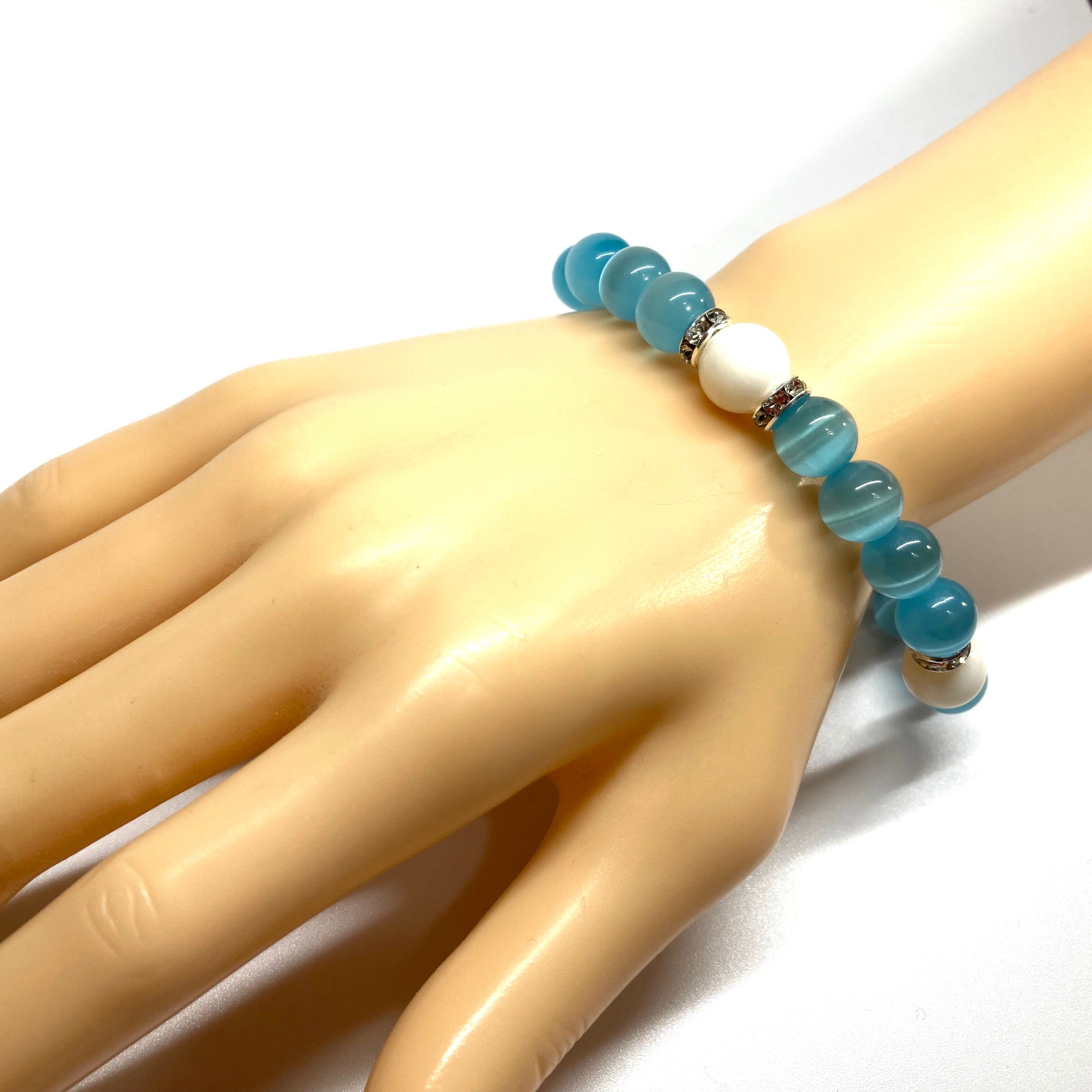 キャッツアイ(ライトブルー)×ホワイトオニキス パワーストーン ブレスレット (シルバー) メンズ・レディース 男性・女性 数珠ブレス 開運