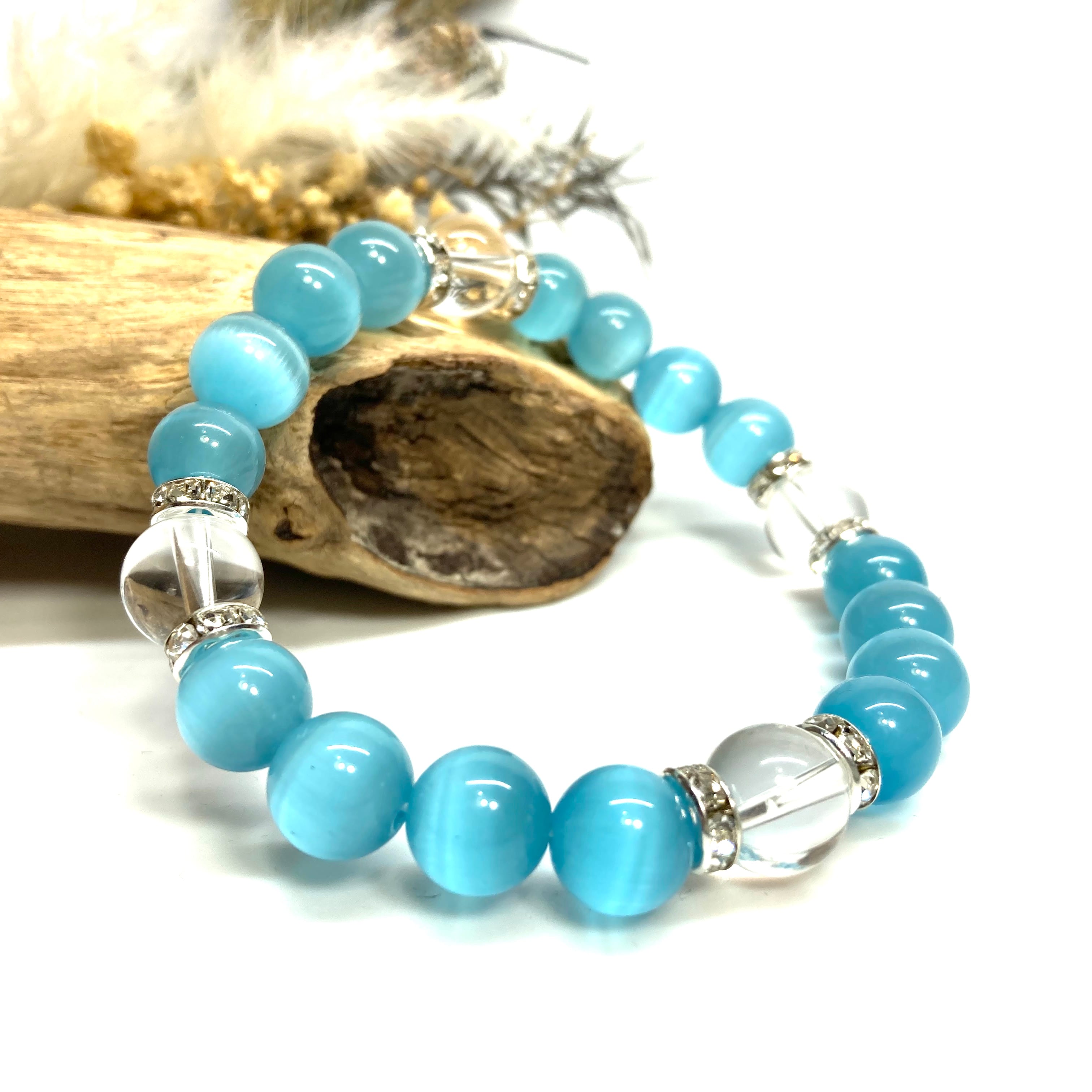 キャッツアイ(ライトブルー)×水晶パワーストーン ブレスレット (シルバー) メンズ・レディース 男性・女性 数珠ブレス 開運