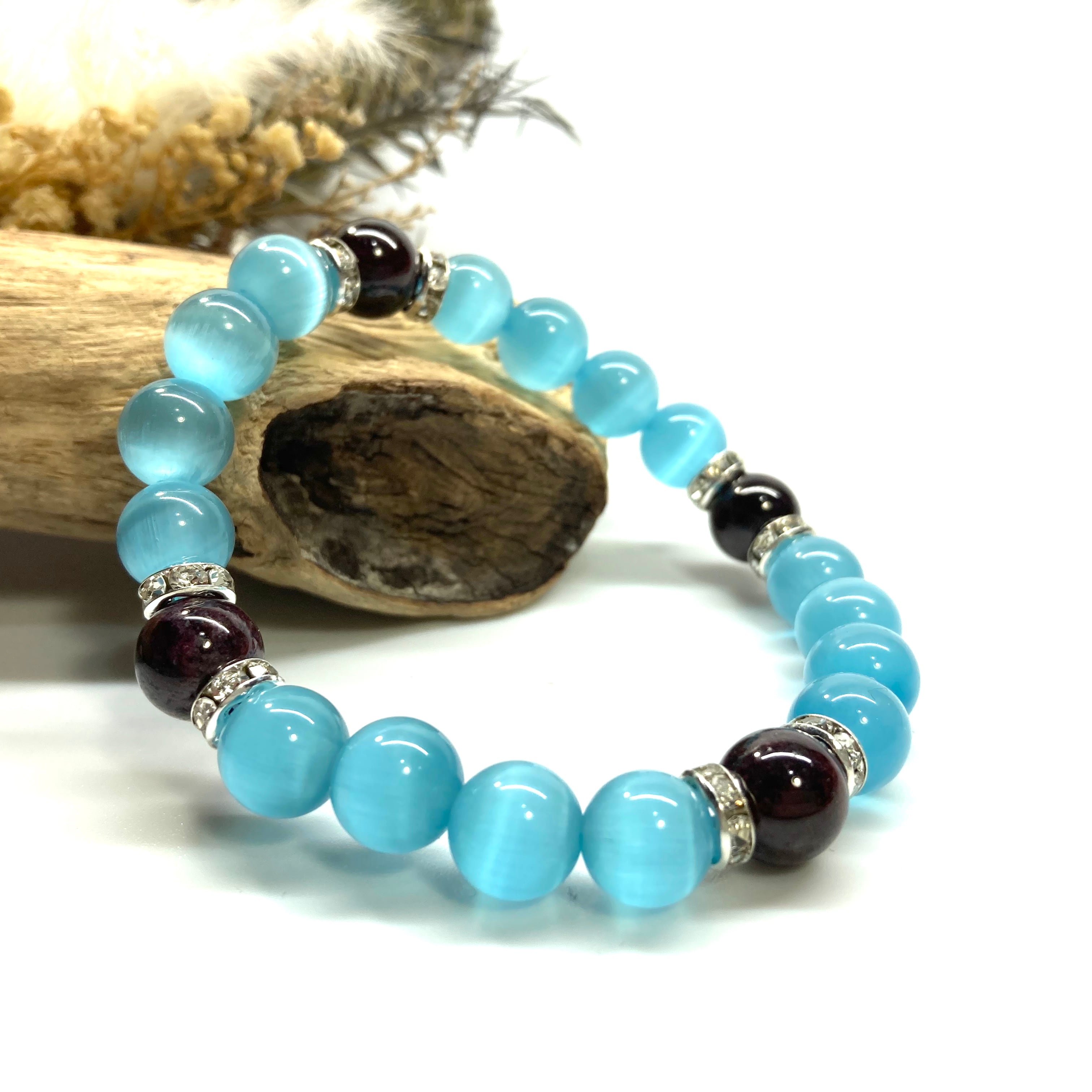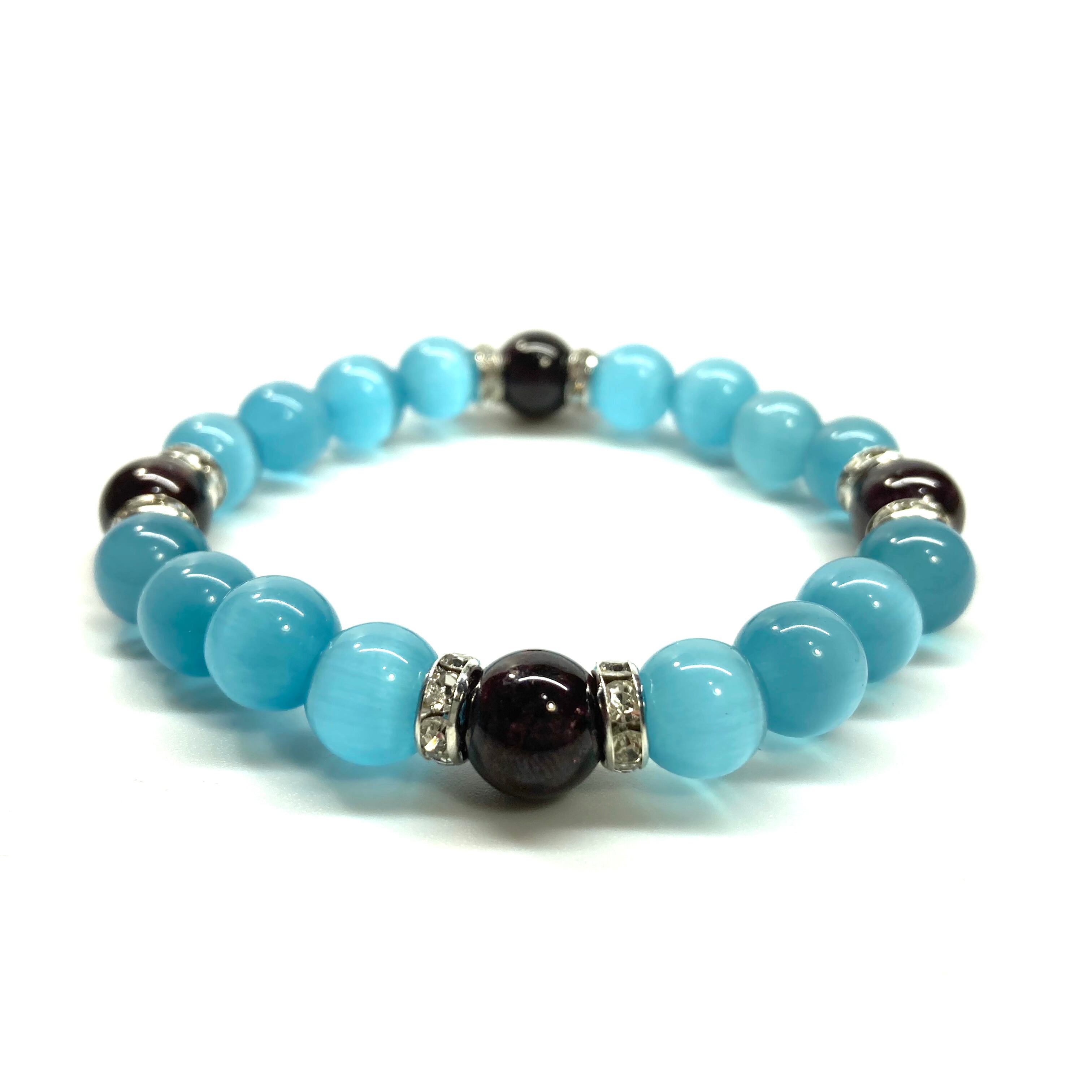 キャッツアイ(ライトブルー)×ガーネット パワーストーン ブレスレット (シルバー) メンズ・レディース 男性・女性 数珠ブレス 開運