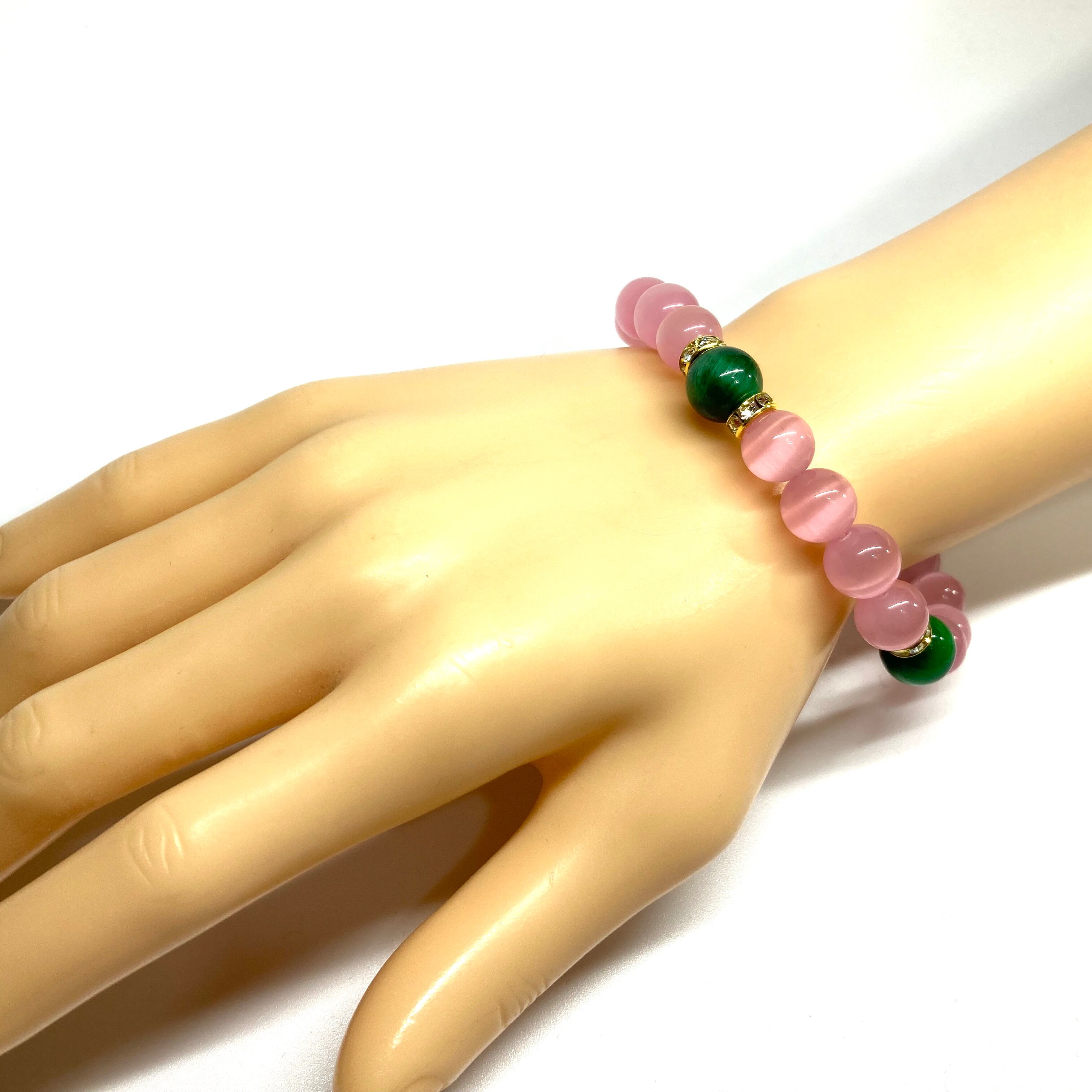 こちらは、キャッツアイとグリータイガーアイを組み合わせたブレスレットです。間にはロンデルを挟み高級感あるデザインに仕上がっています。石大きさは腕にも馴染みやすいように10mm玉で内周約17cm(伸可能)です。数に限りがございますので気になる方はお早めにどうぞ。