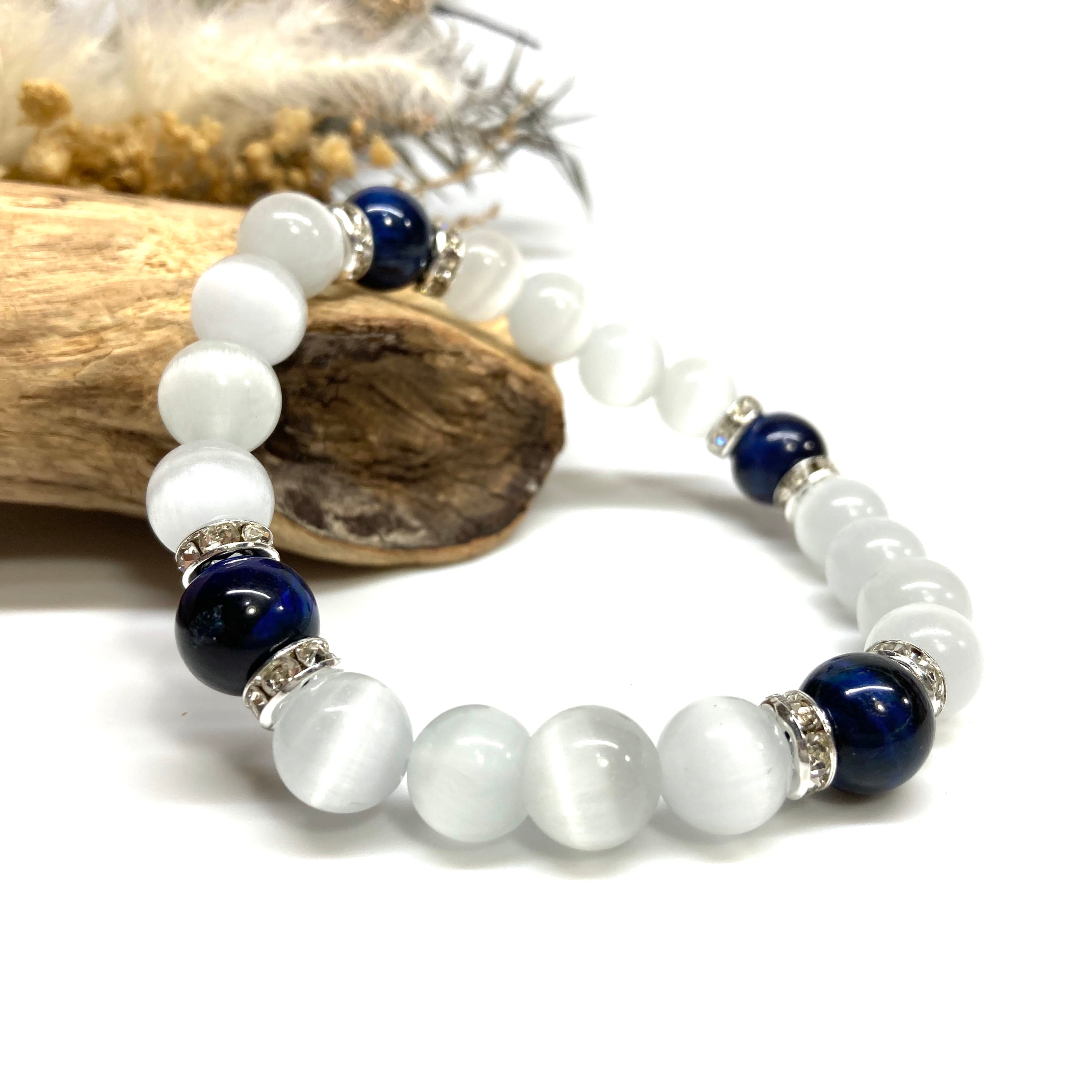 キャッツアイ(ホワイト)×ブルータイガーアイ パワーストーン ブレスレット (シルバー) メンズ・レディース 男性・女性 数珠ブレス 開運