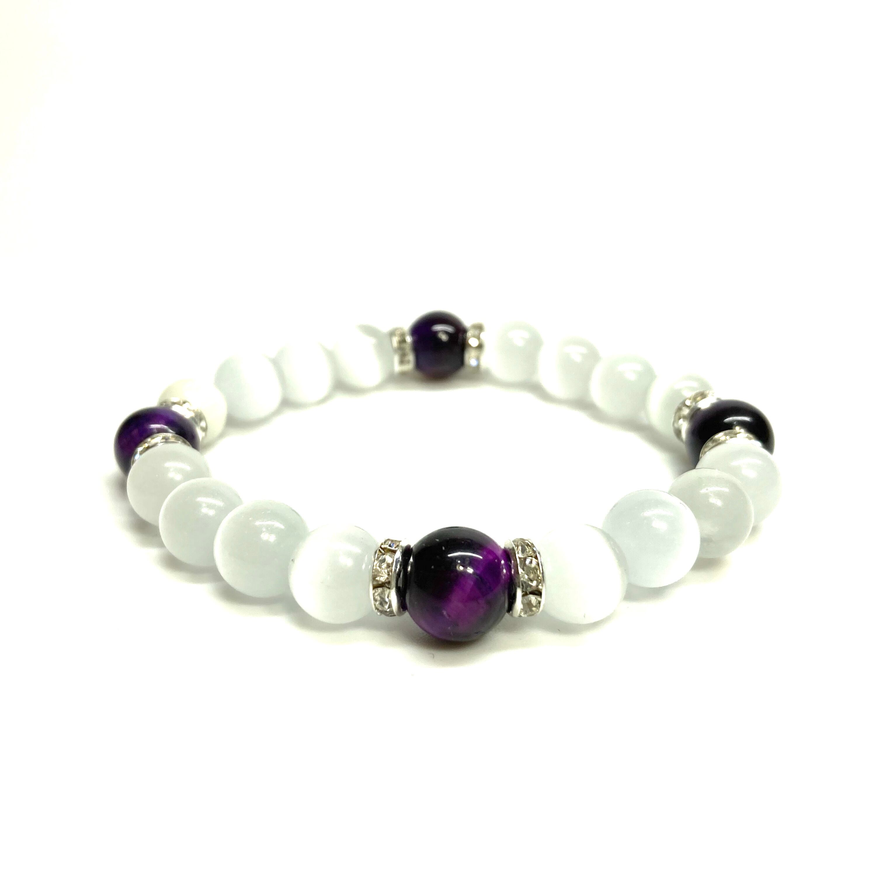 キャッツアイ(ホワイト)×パープルタイガーアイ パワーストーン ブレスレット (シルバー) メンズ・レディース 男性・女性 数珠ブレス 開運