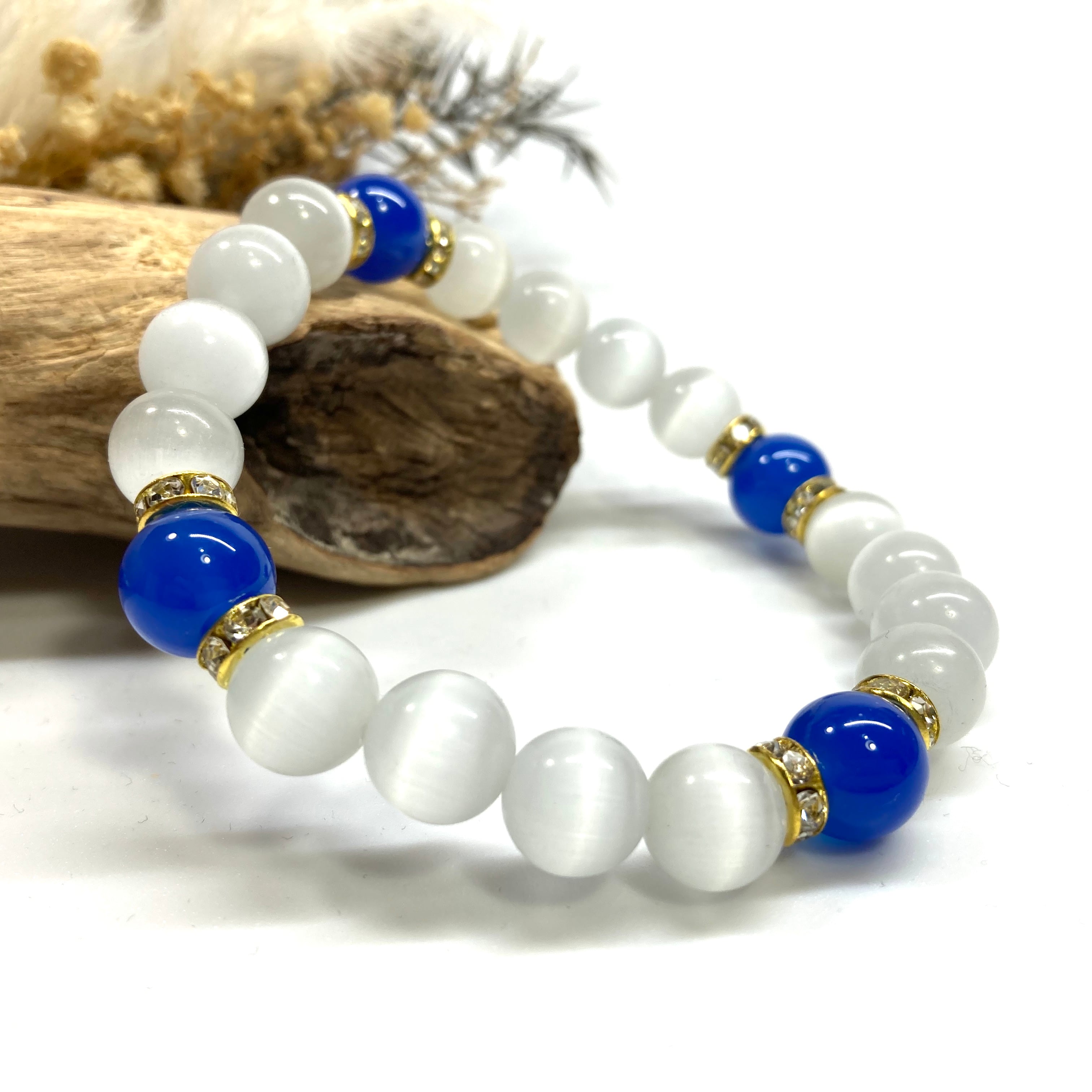 キャッツアイ(ホワイト)×青瑪瑙 パワーストーン ブレスレット (ゴールド) メンズ・レディース 男性・女性 数珠ブレス 開運