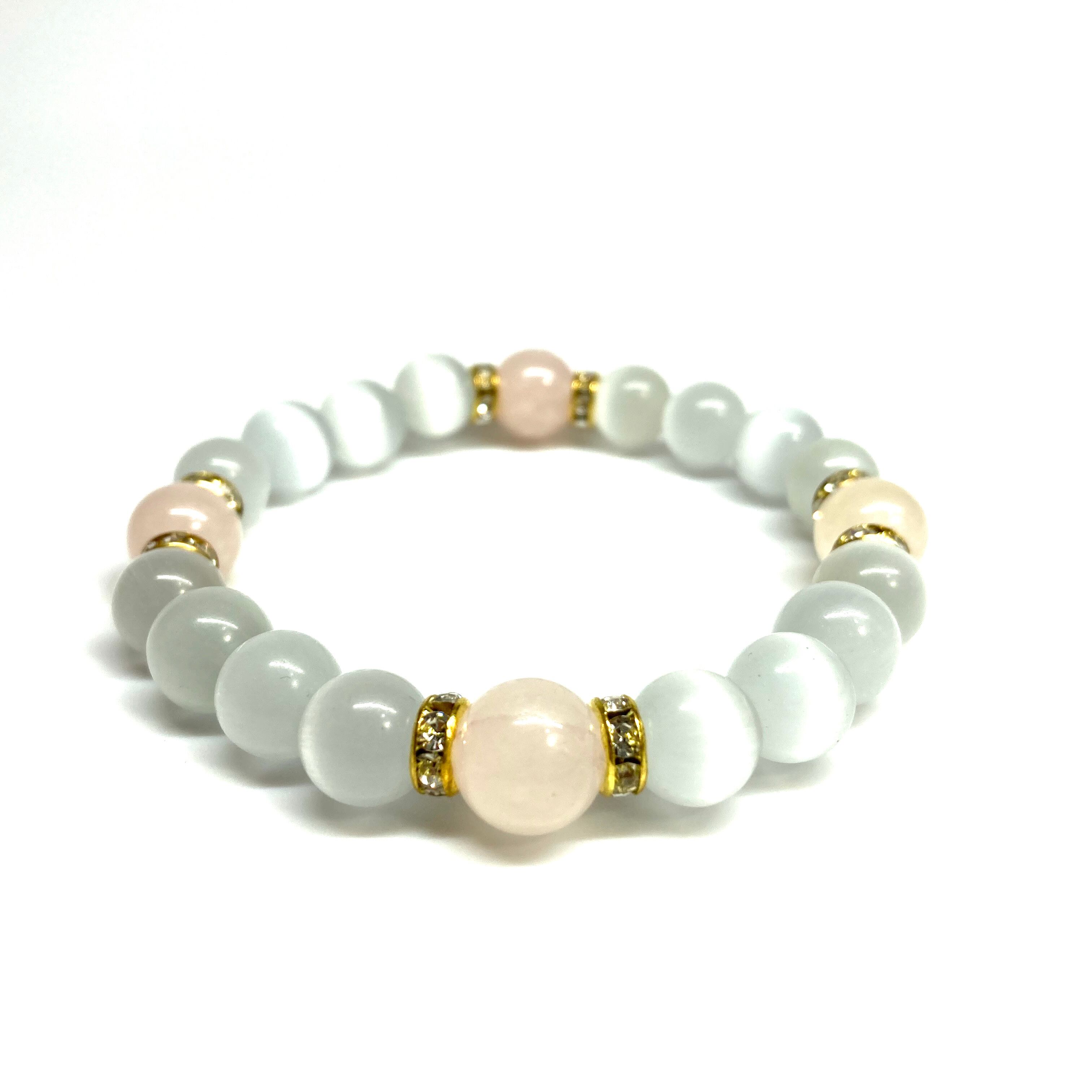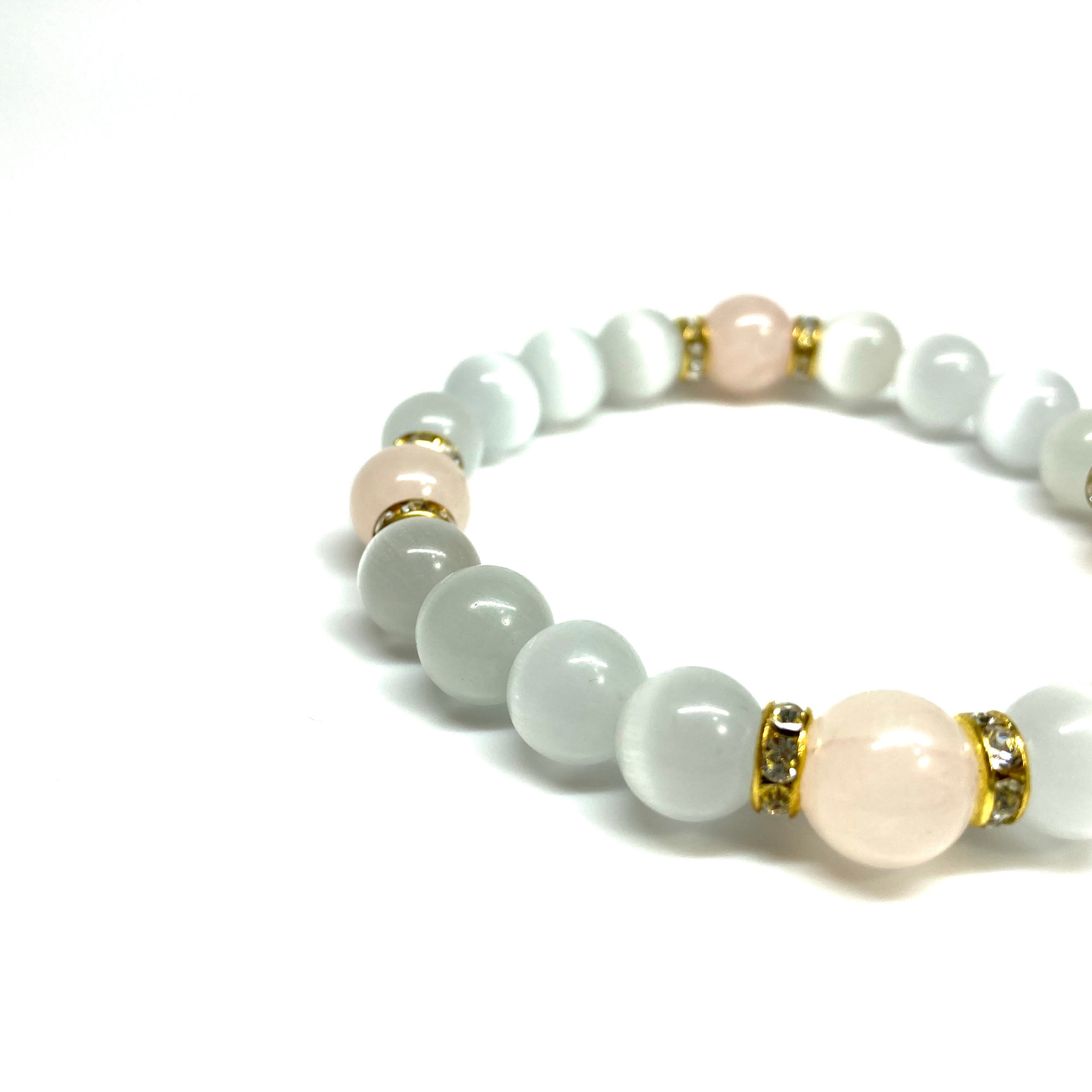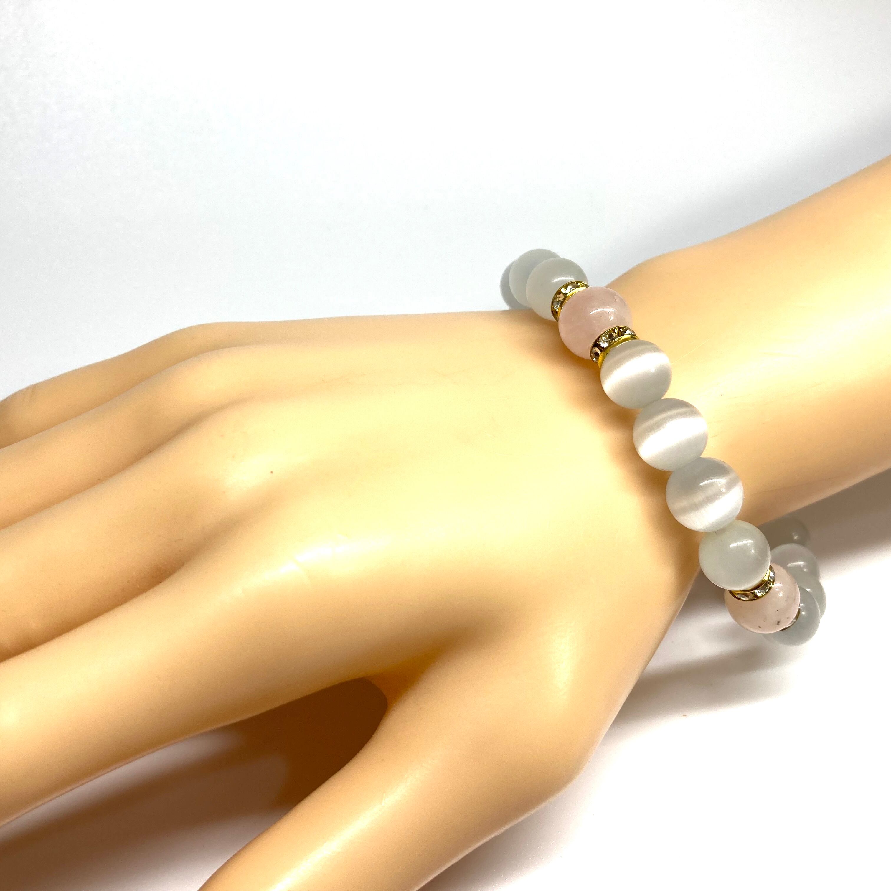 こちらは、キャッツアイとローズクォーツを組み合わせたブレスレットです。間にはロンデルを挟み高級感あるデザインに仕上がっています。石大きさは腕にも馴染みやすいように10mm玉で内周約17cm(伸可能)です。数に限りがございますので気になる方はお早めにどうぞ。