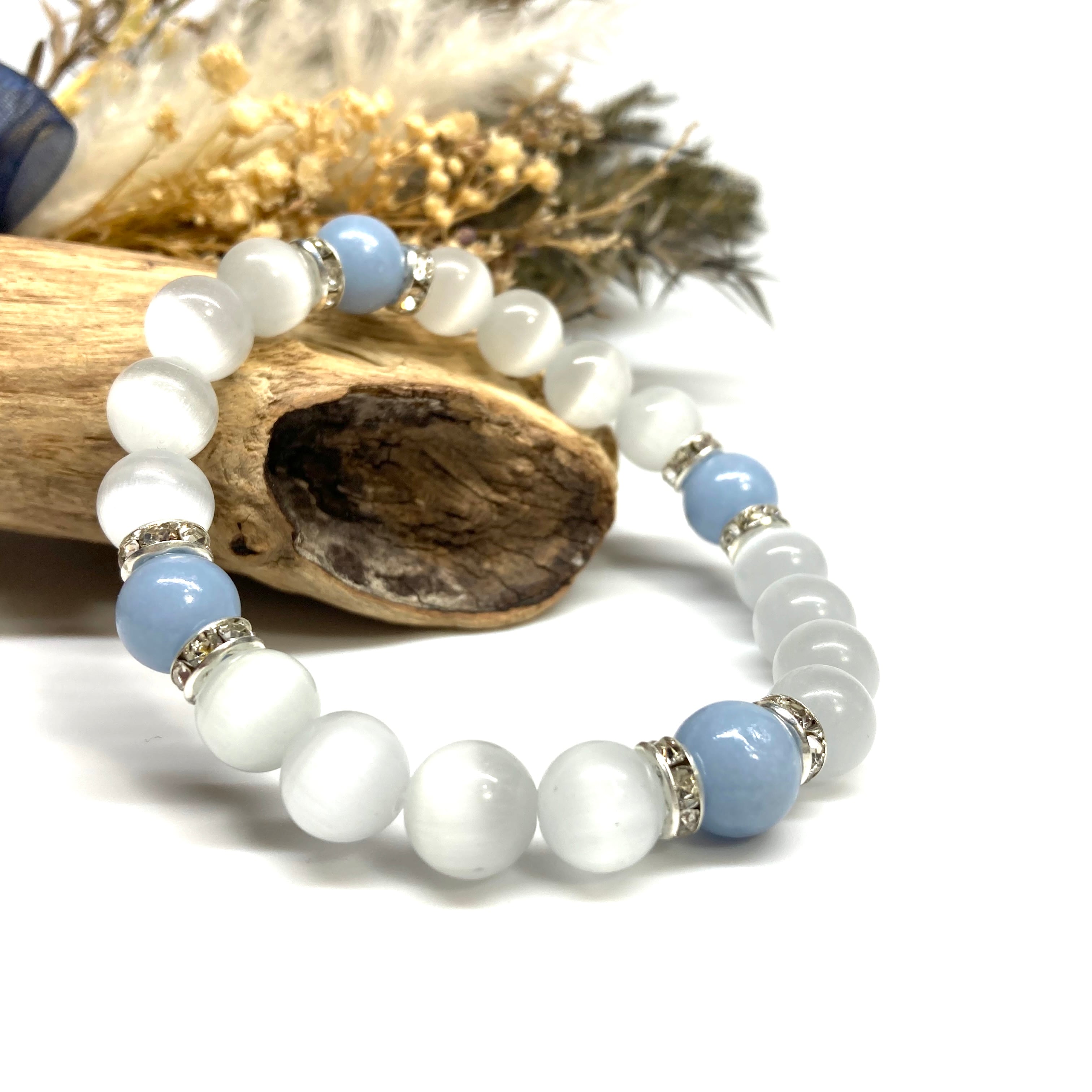こちらは、キャッツアイとエンジェライトを組み合わせたブレスレットです。間にはロンデルを挟み高級感あるデザインに仕上がっています。石大きさは腕にも馴染みやすいように10mm玉で内周約17cm(伸可能)です。数に限りがございますので気になる方はお早めにどうぞ。