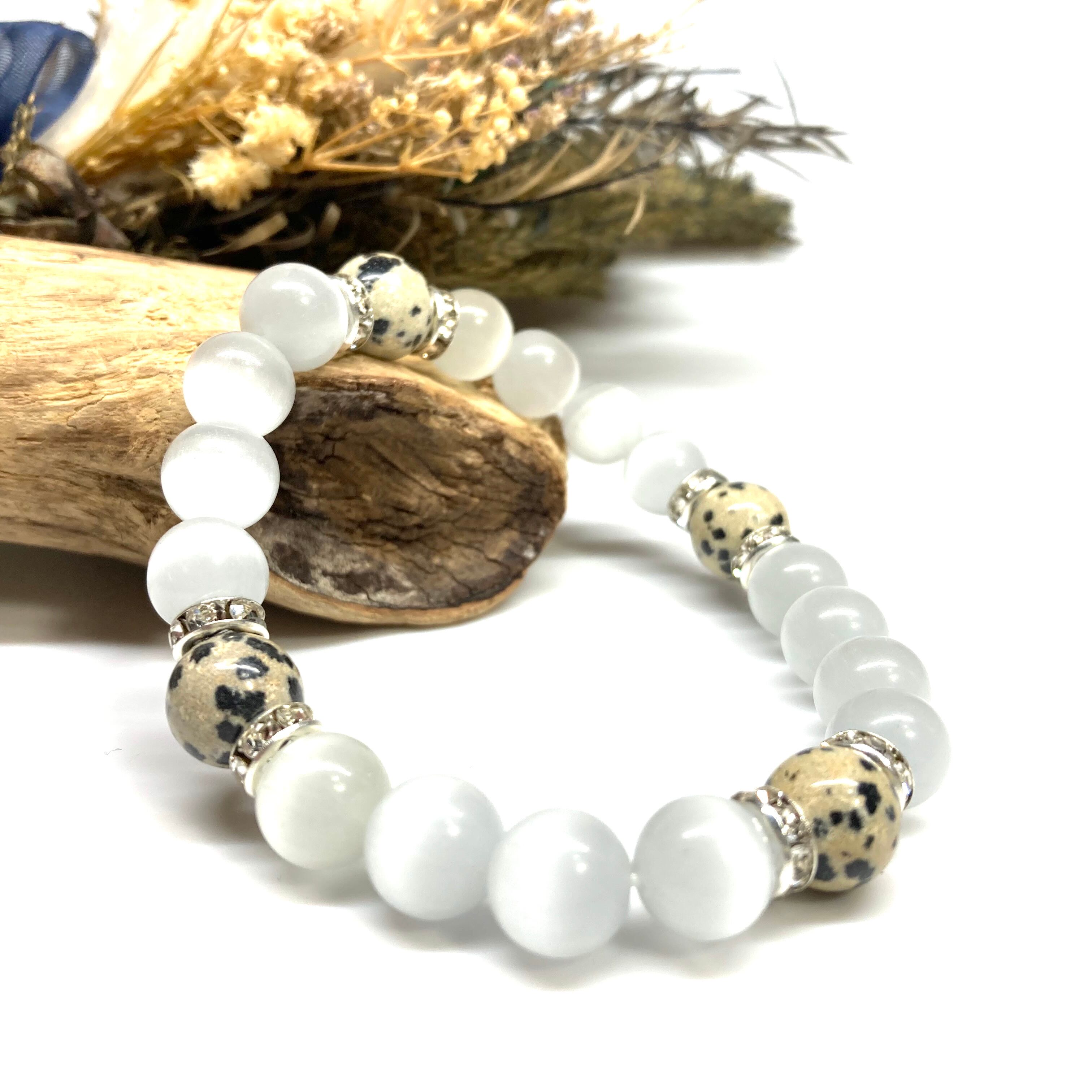 こちらは、キャッツアイとダルメシアンジャスパーを組み合わせたブレスレットです。間にはロンデルを挟み高級感あるデザインに仕上がっています。石大きさは腕にも馴染みやすいように10mm玉で内周約17cm(伸可能)です。数に限りがございますので気になる方はお早めにどうぞ。