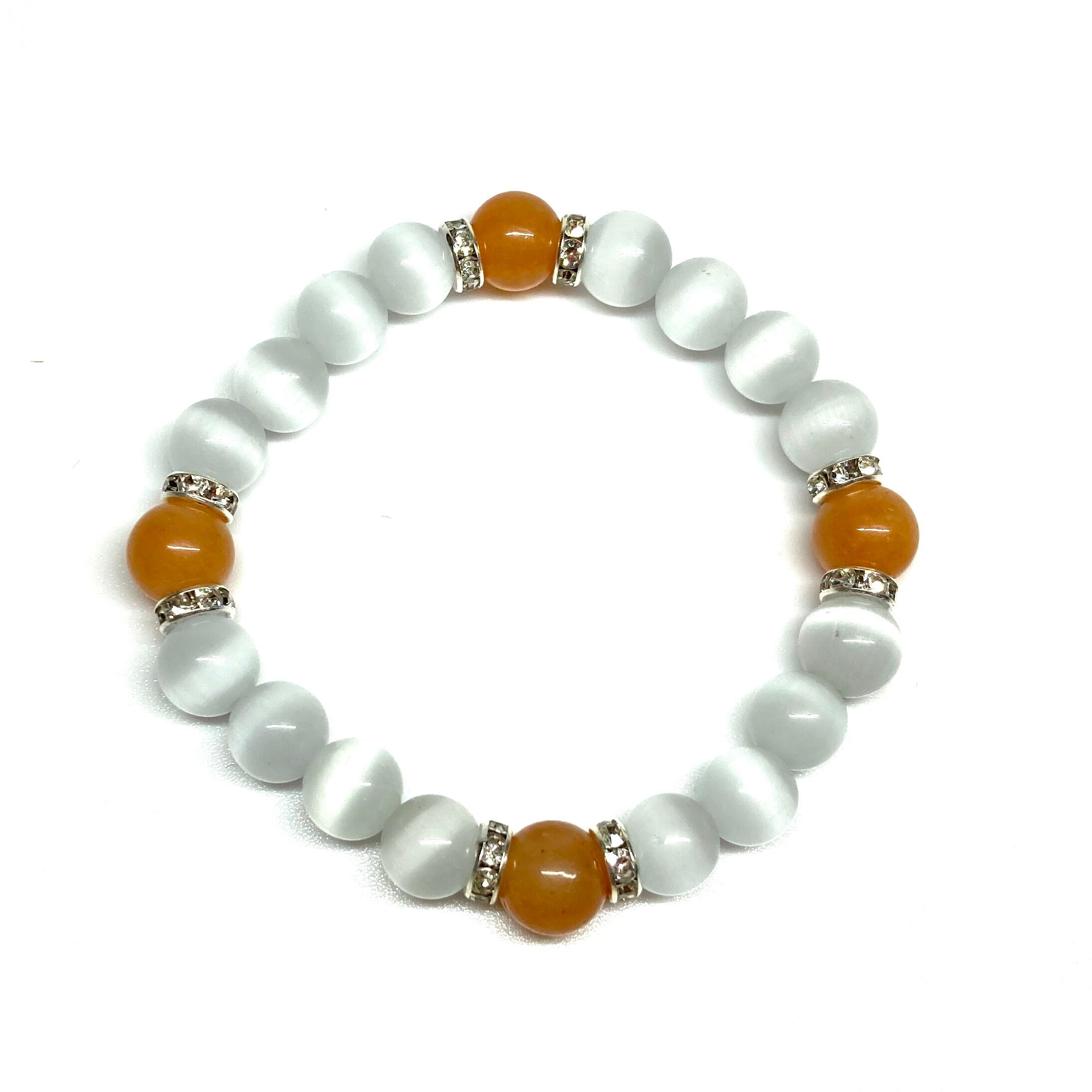 こちらは、キャッツアイとレッドアベンチュリンを組み合わせたブレスレットです。間にはロンデルを挟み高級感あるデザインに仕上がっています。石大きさは腕にも馴染みやすいように10mm玉で内周約17cm(伸可能)です。数に限りがございますので気になる方はお早めにどうぞ。